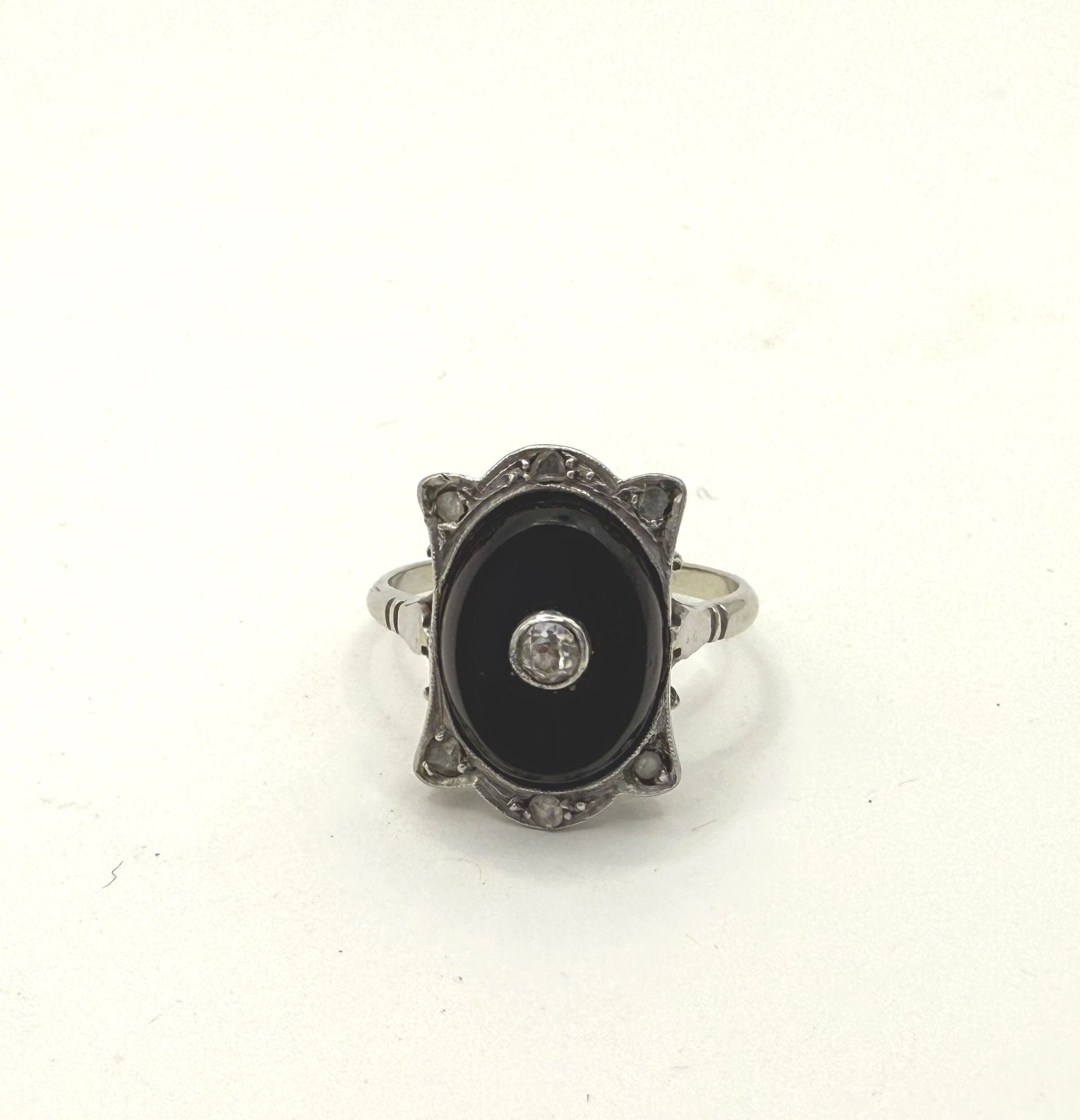 Bague en or gris (750 millièmes) et platine ornée d’un plaque d’onyx ovale et diamants. - Lazuli