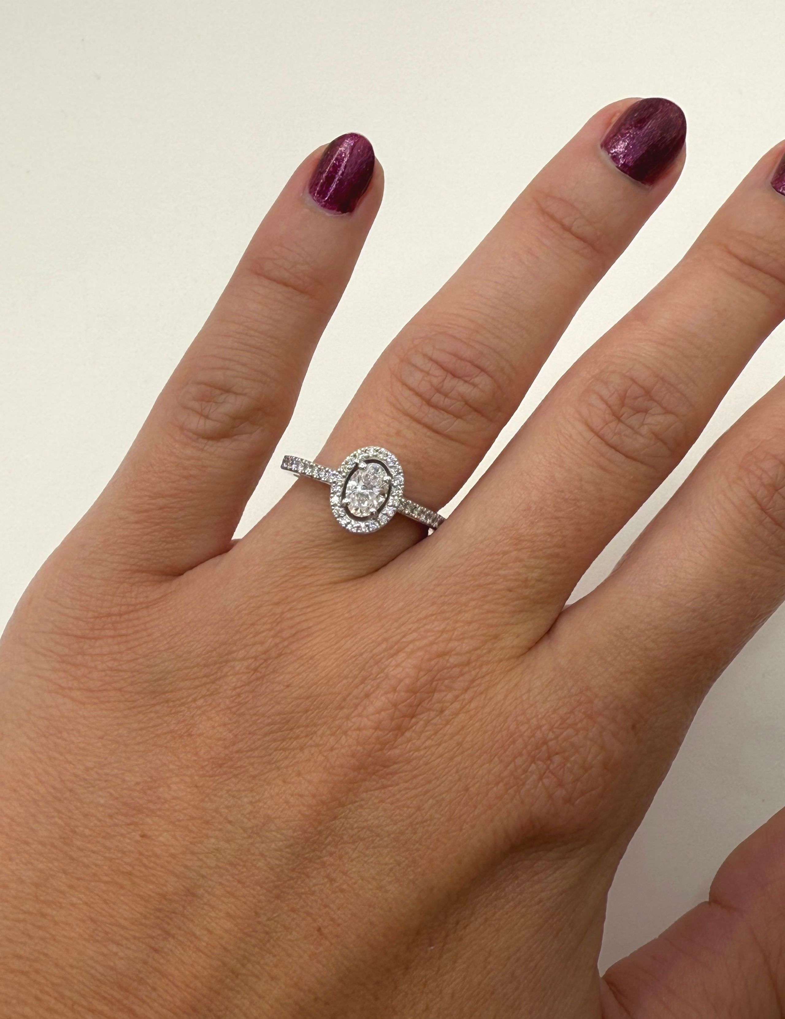 40 - Bague en or gris (750 millièmes) ornée d’un diamant ovale dans un entourage de brillants épaulé d’une ligne de brillants.