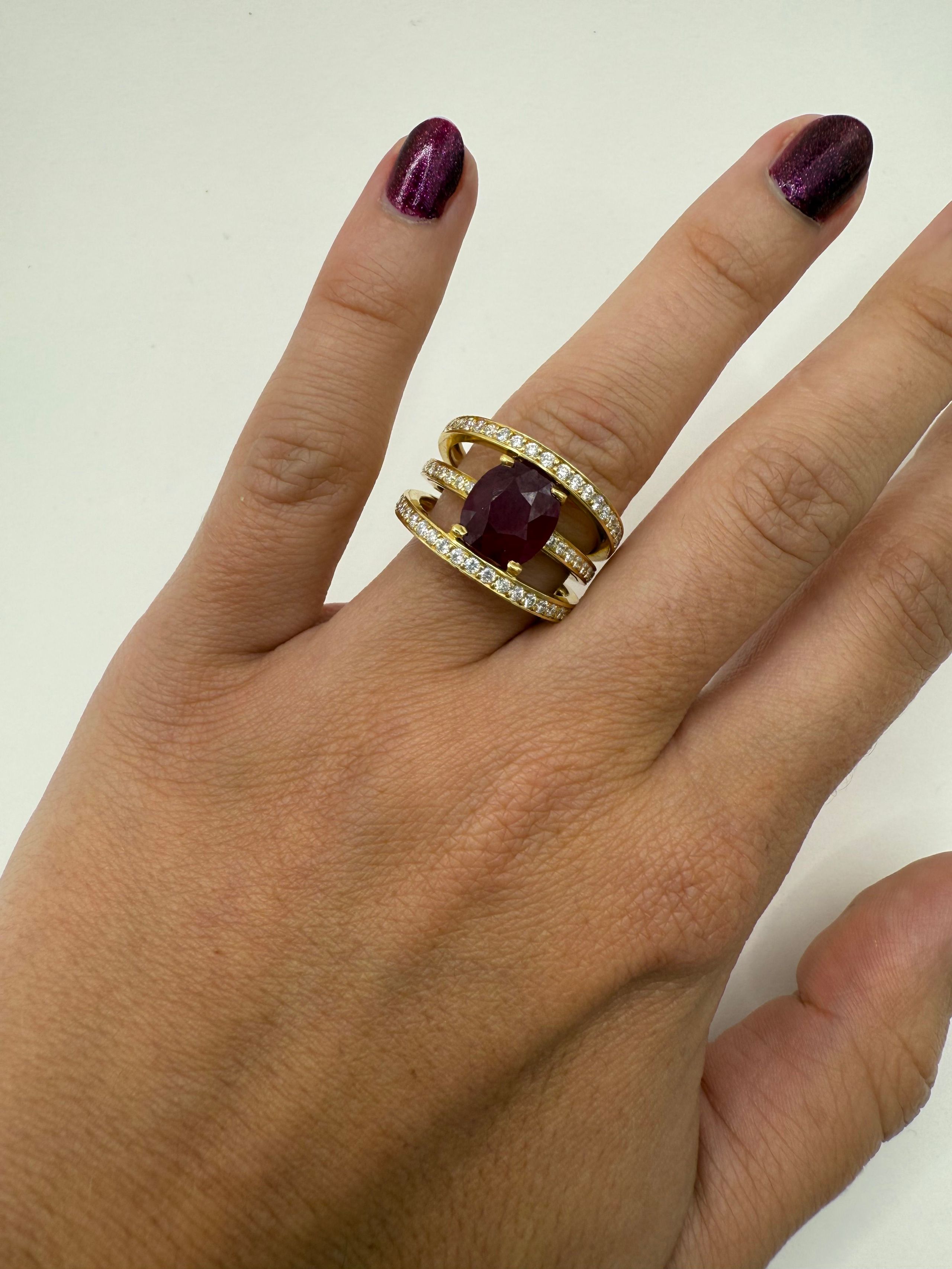 13 - Bague en or jaune (750 millièmes) ornée d’un rubis ovale et formée de trois anneaux solidaires sertis pour moitié d’une ligne de brillants.