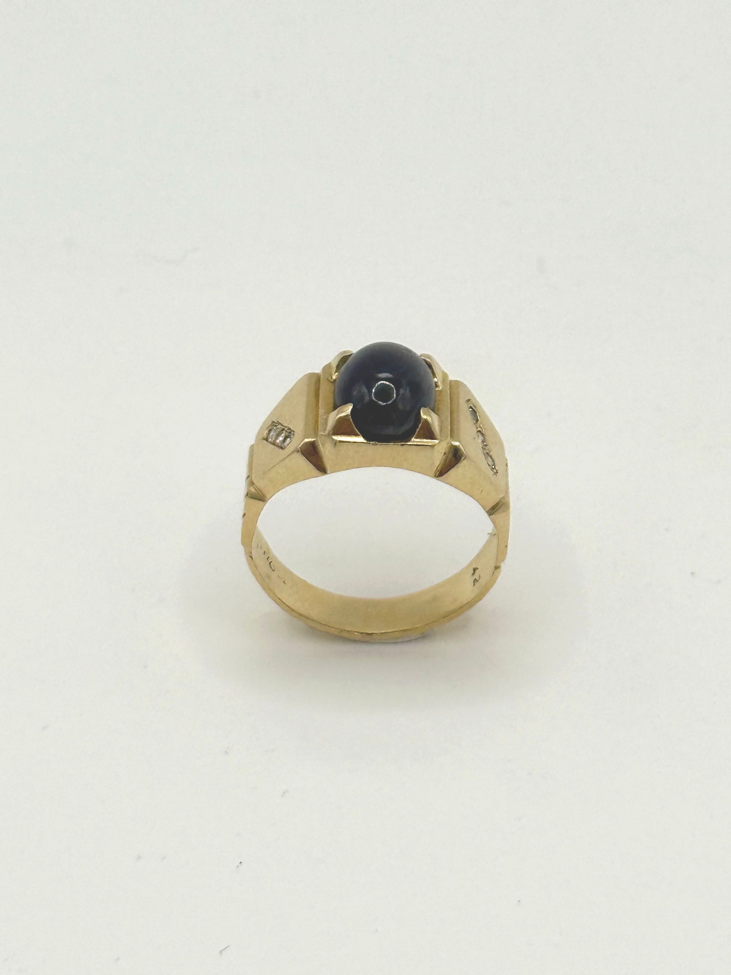 117 - Bague en or jaune (750 millièmes) ornée d’un saphir ovale cabochon épaulé de pierres blanches.