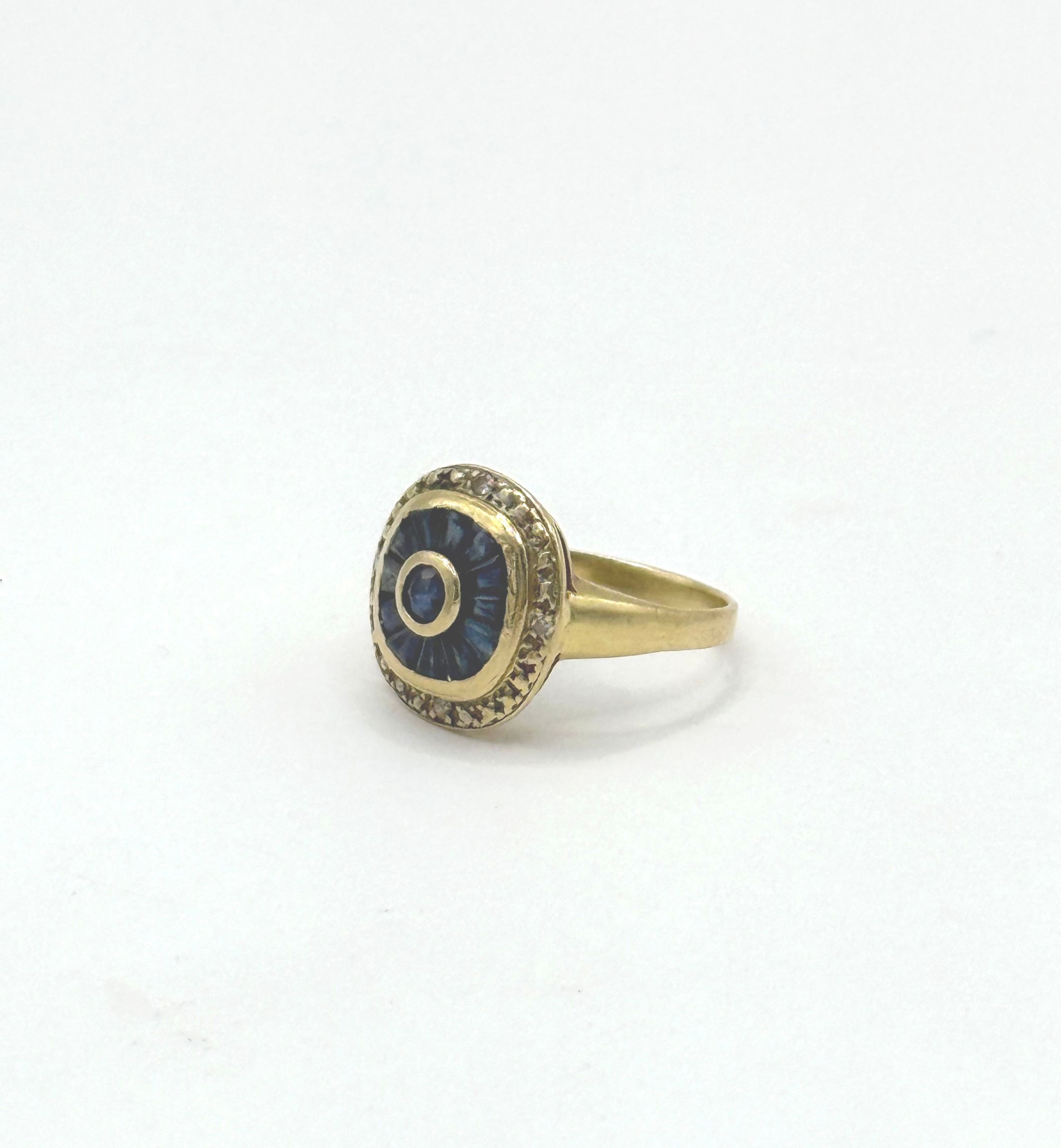 Bague en or jaune (750 millièmes) ornée d’un saphir rond dans un entourage de saphirs calibrés et de quatre brillants. - Lazuli