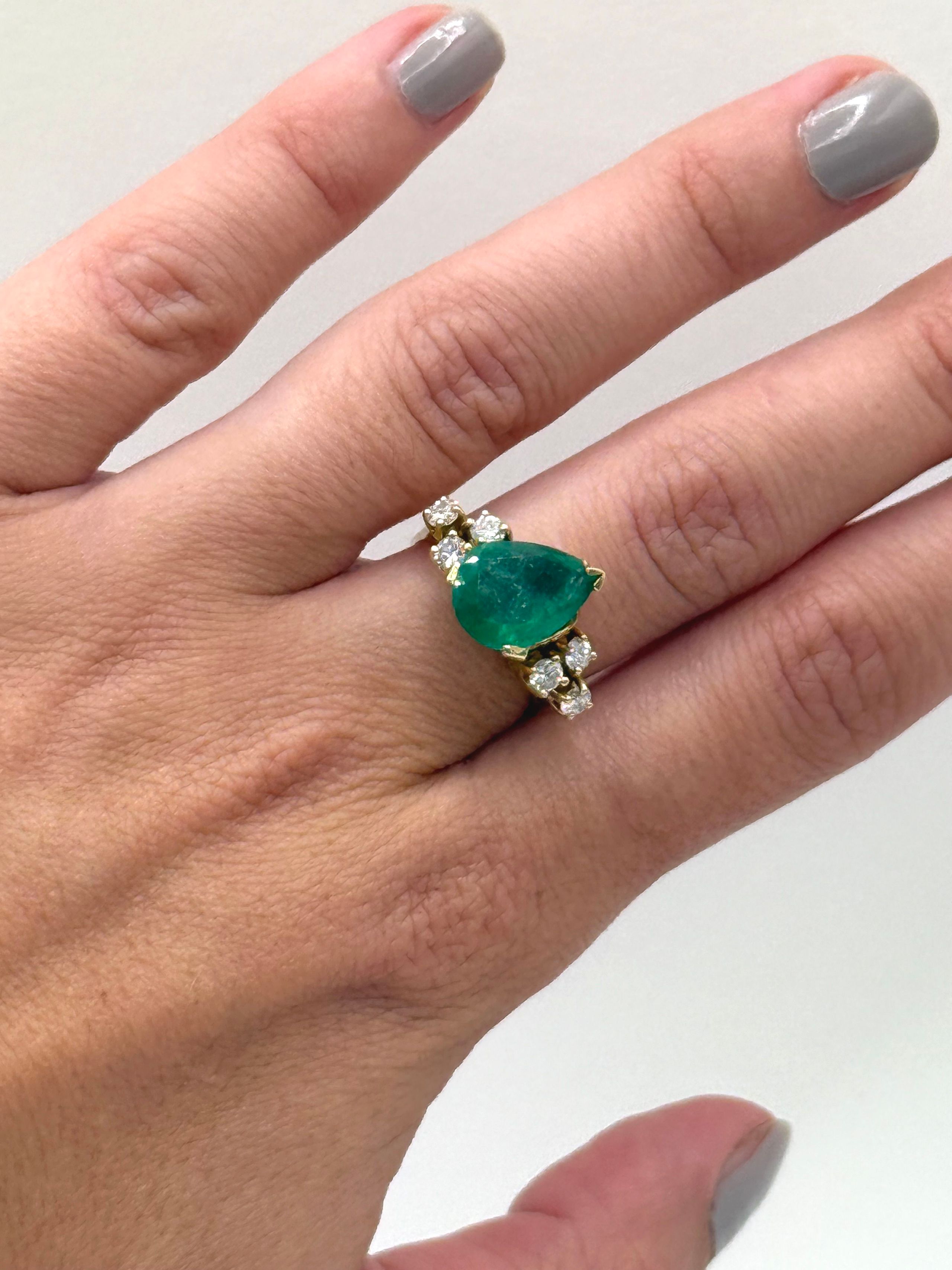 23 - Bague en or jaune (750 millièmes) ornée d’une émeraude poire épaulée de trois diamants de part et d’autre.