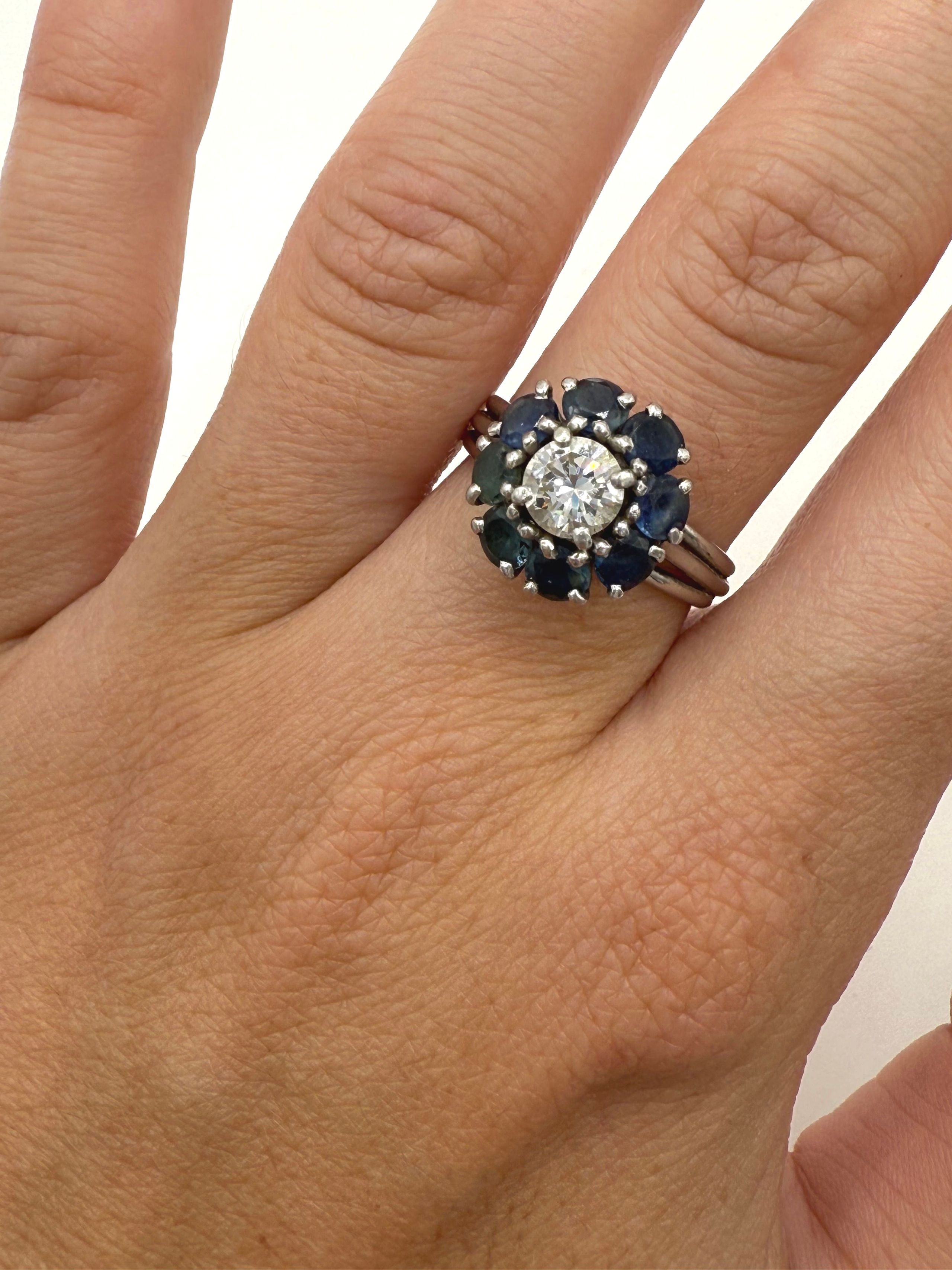 116 - Bague fleur en or gris (750 millièmes) ornée d’un diamant rond taille moderne dans un entourage de huit saphirs ronds.