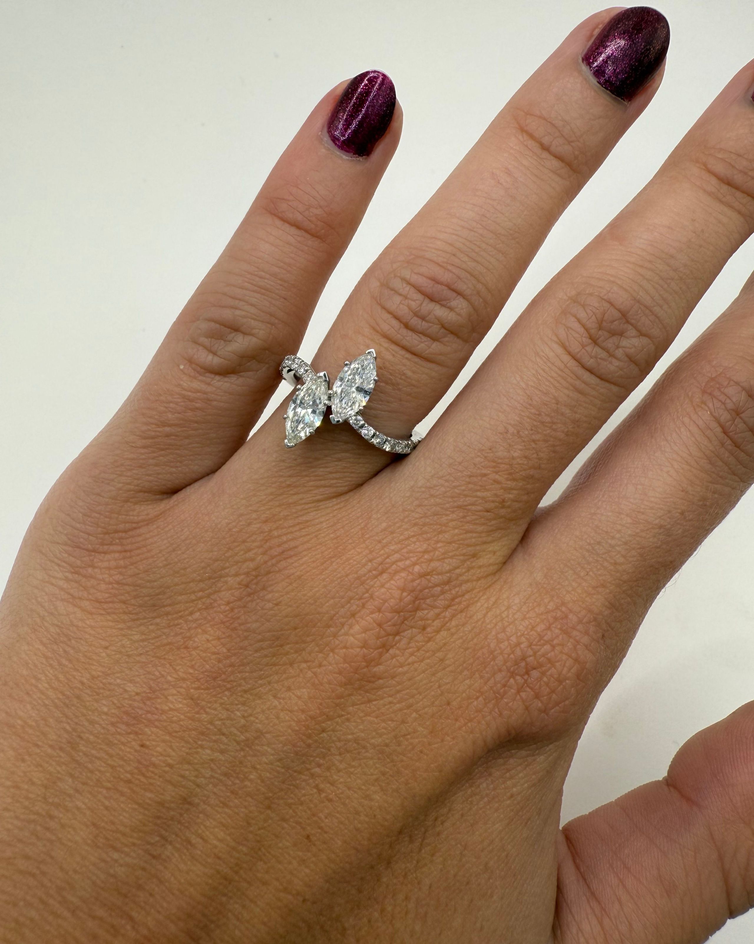 56 - Bague toi & moi en or gris (750 millièmes) ornée de deux diamants marquises épaulés d’une ligne de brillants de part et d’autre.