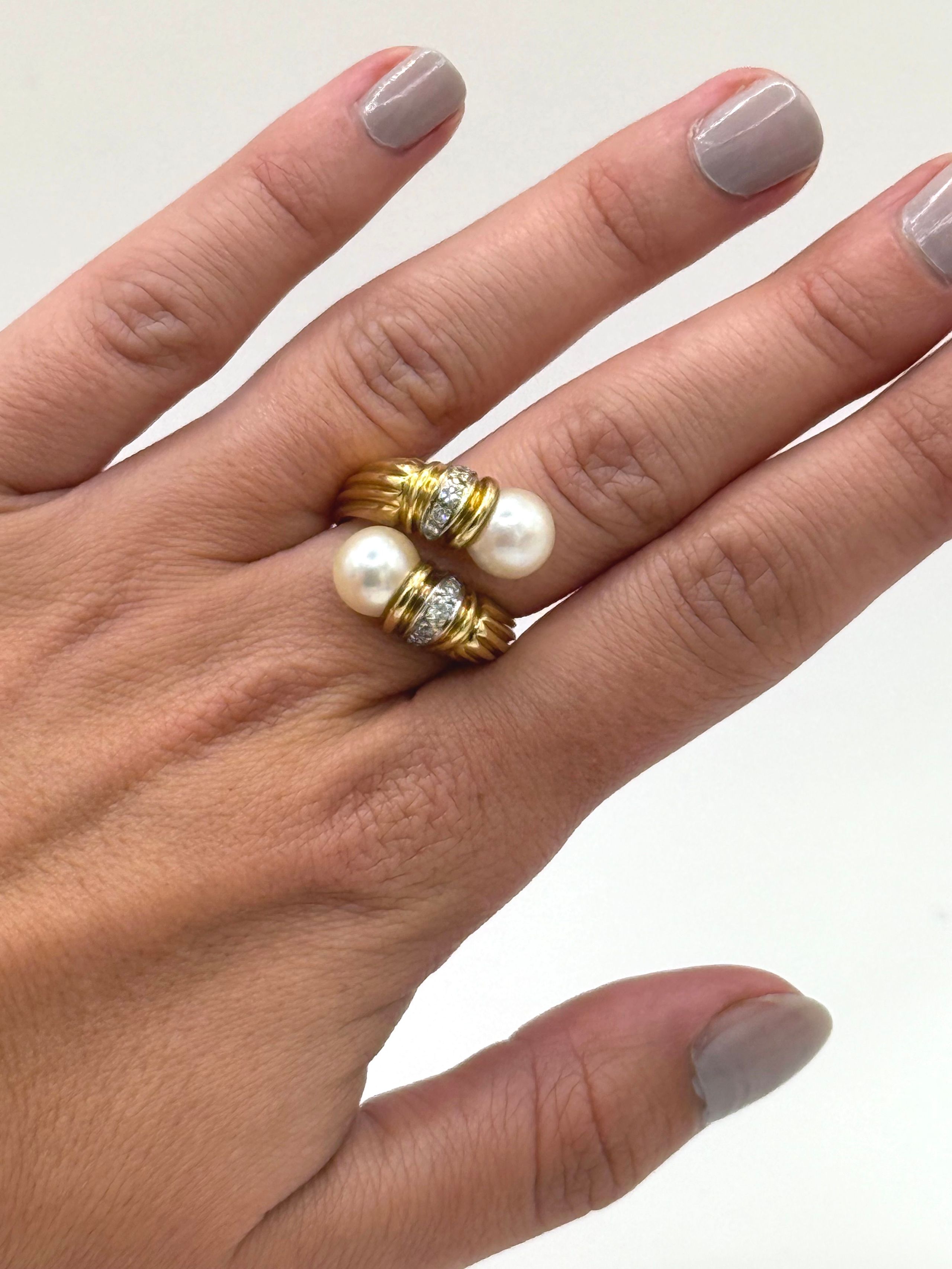 Bague toi & moi godronnée en or jaune (750 millièmes) ornée de deux perles de culture et brillants. - Lazuli