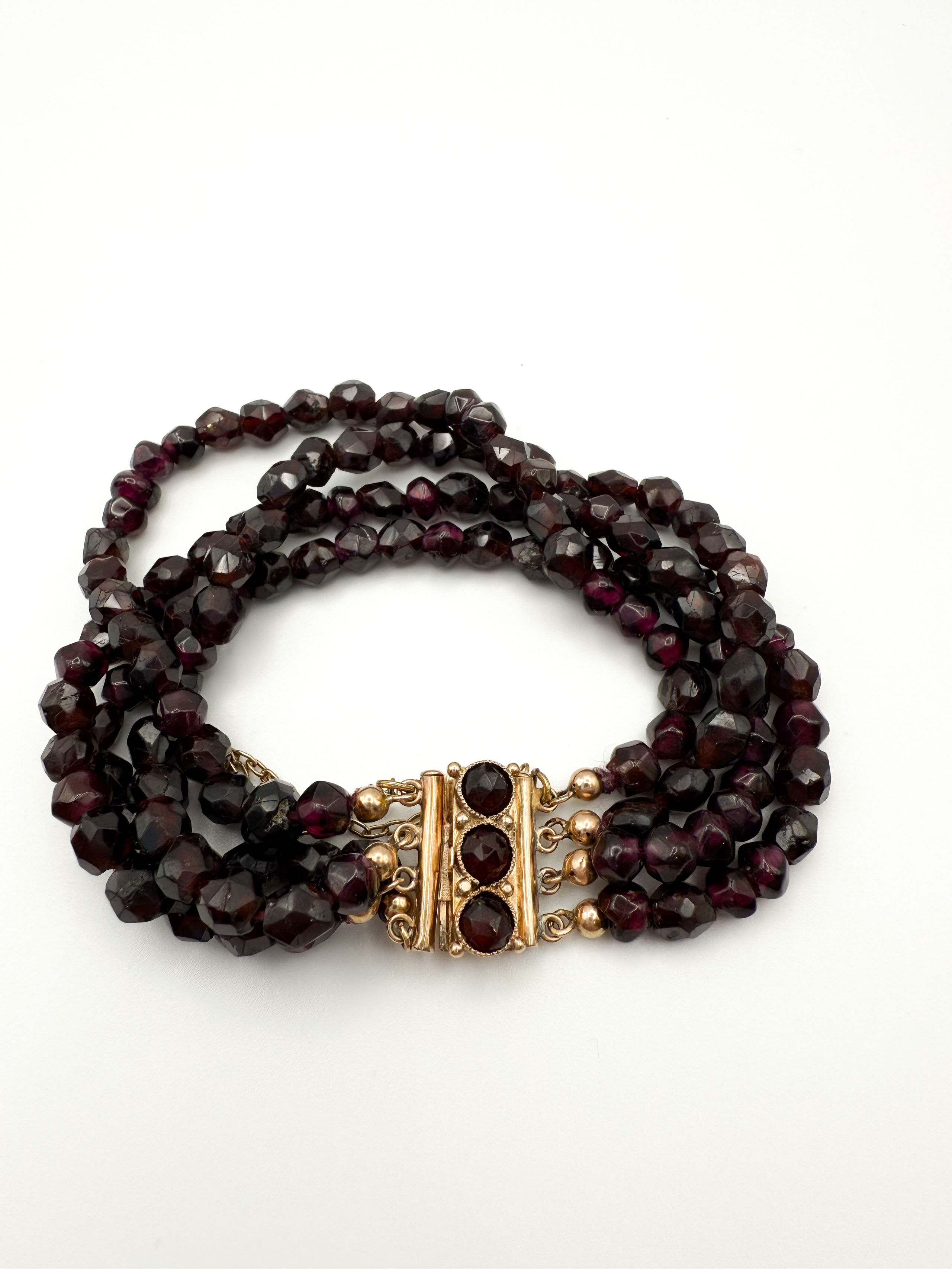 39 - Bracelet quatre rangs de perles de grenat facettées, le fermoir en or jaune (750 millièmes) orné de trois grenats.