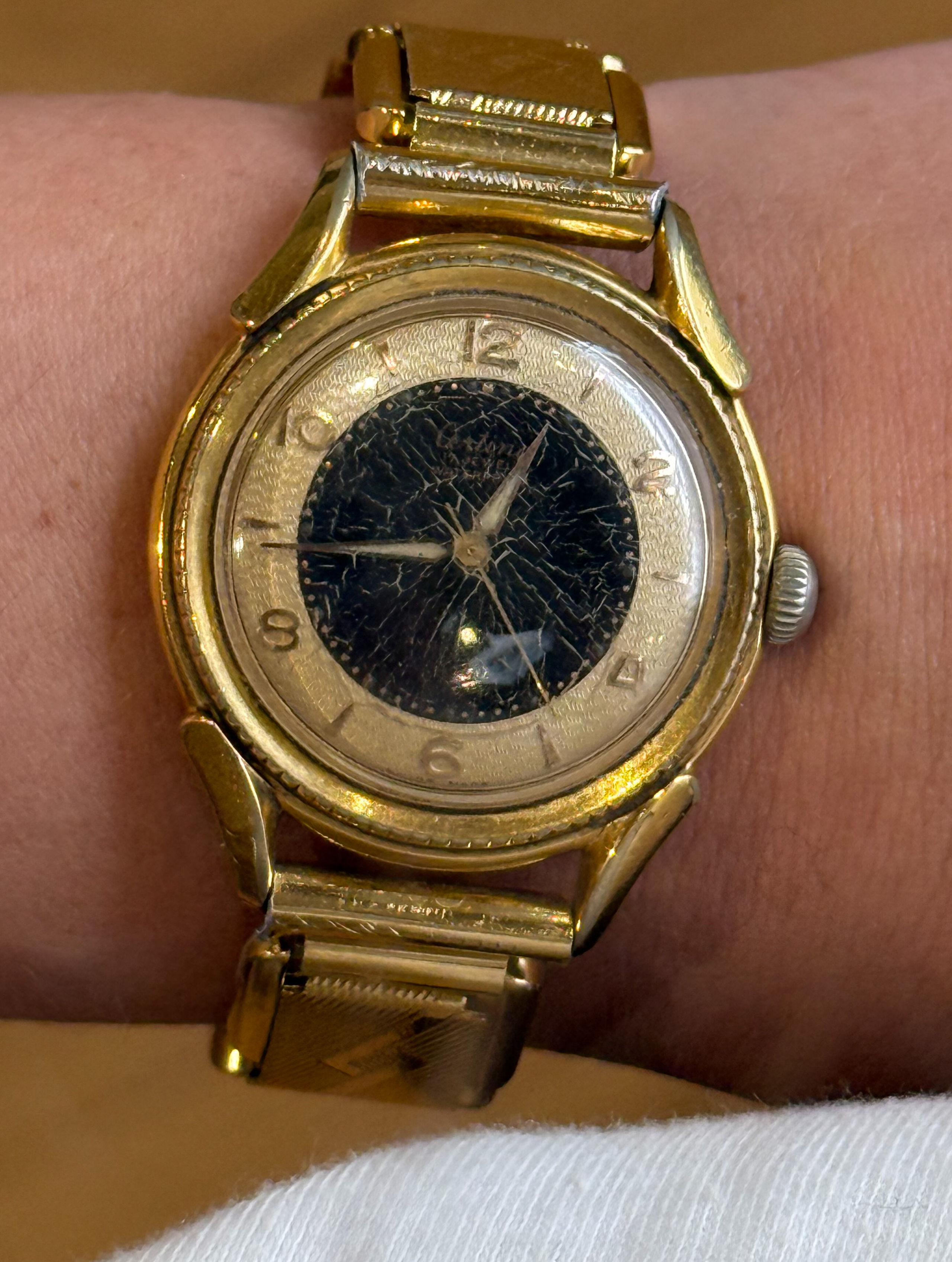 Cadran à fond bicoloroe doré et noir, chiffres arabes et index bâtons.