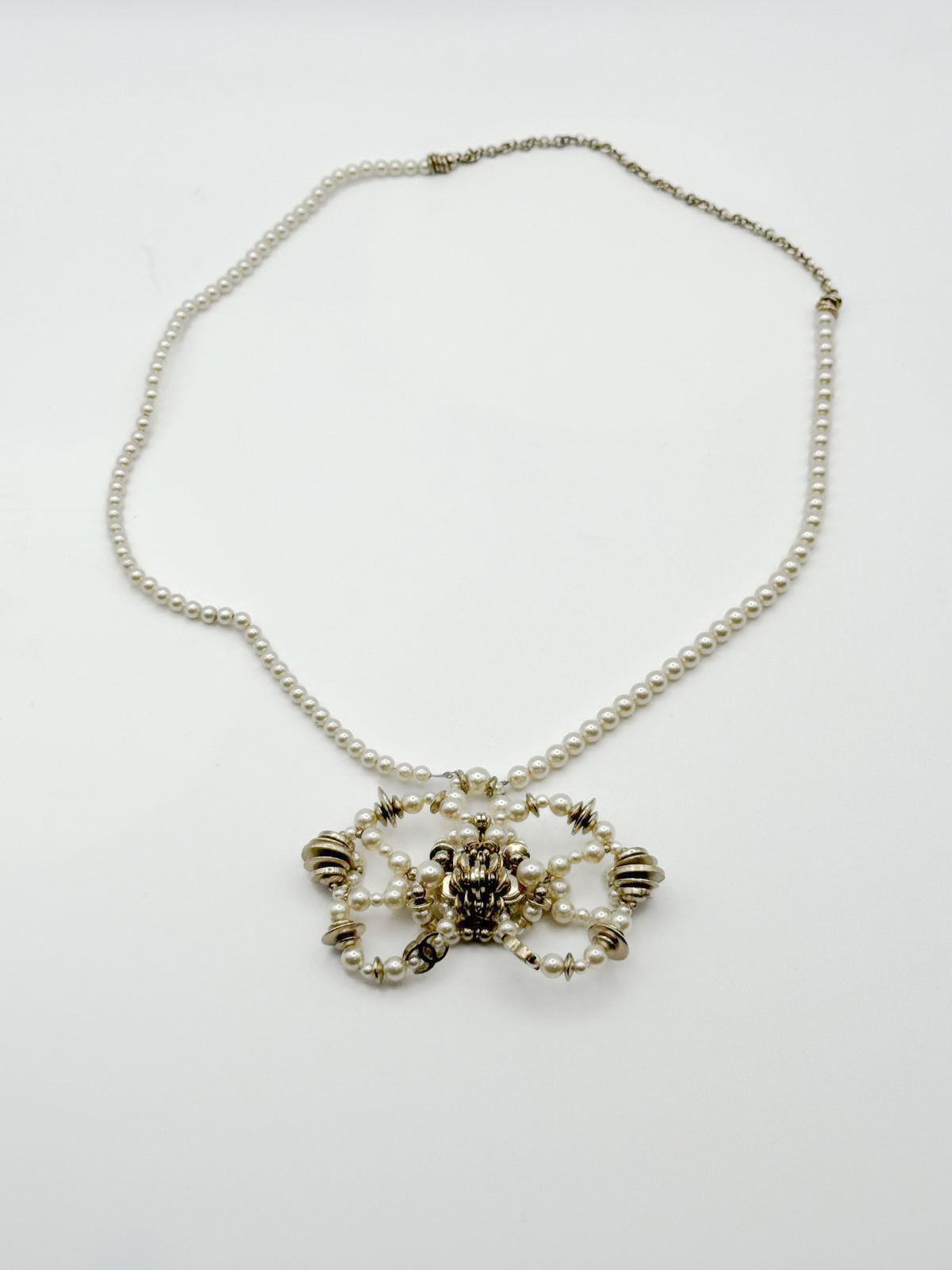 Collier en métal doré et perles fantaisie centré d'un camélia. Tour de cou : 60 cm.