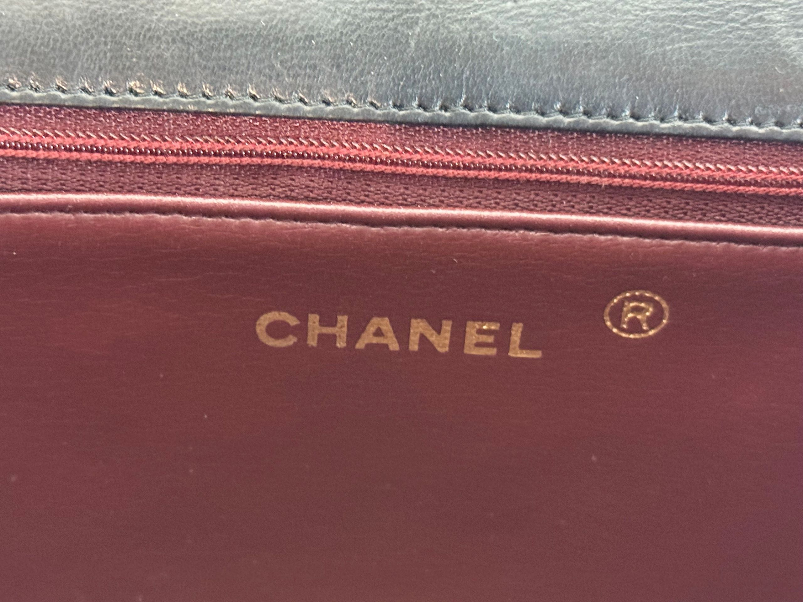 Sac à rabat en agneau matelassé noir, fermoir pivotant en métal plaqué or, anse chaîne entrelacée de cuir, doublure bordeaux agrémentée d'une poche zippée) Hauteur : 18 cm. Longueur : 25 cm - Profondeur : 6cm Etat usité. Expert : Madame Martine Lecamus.