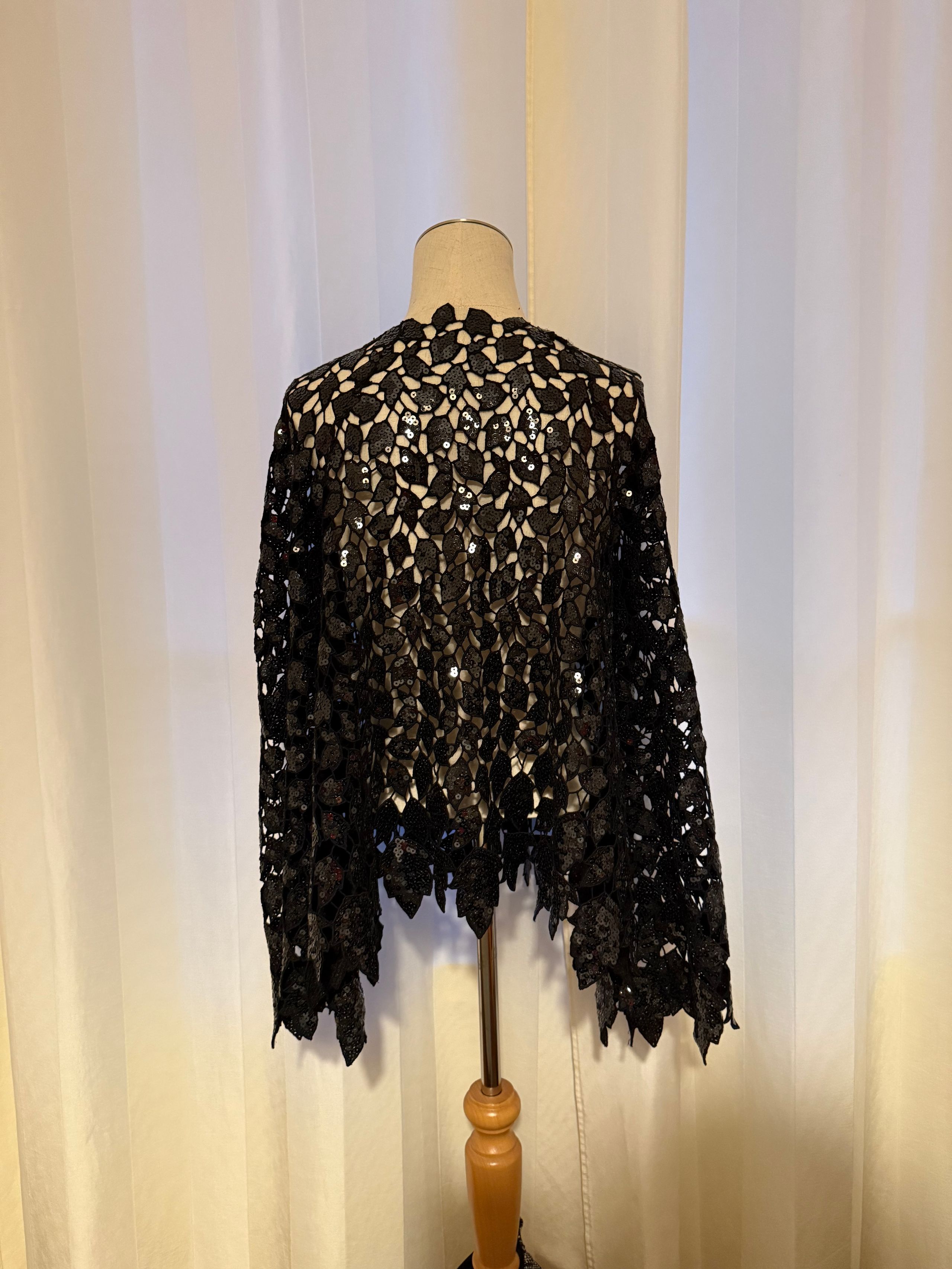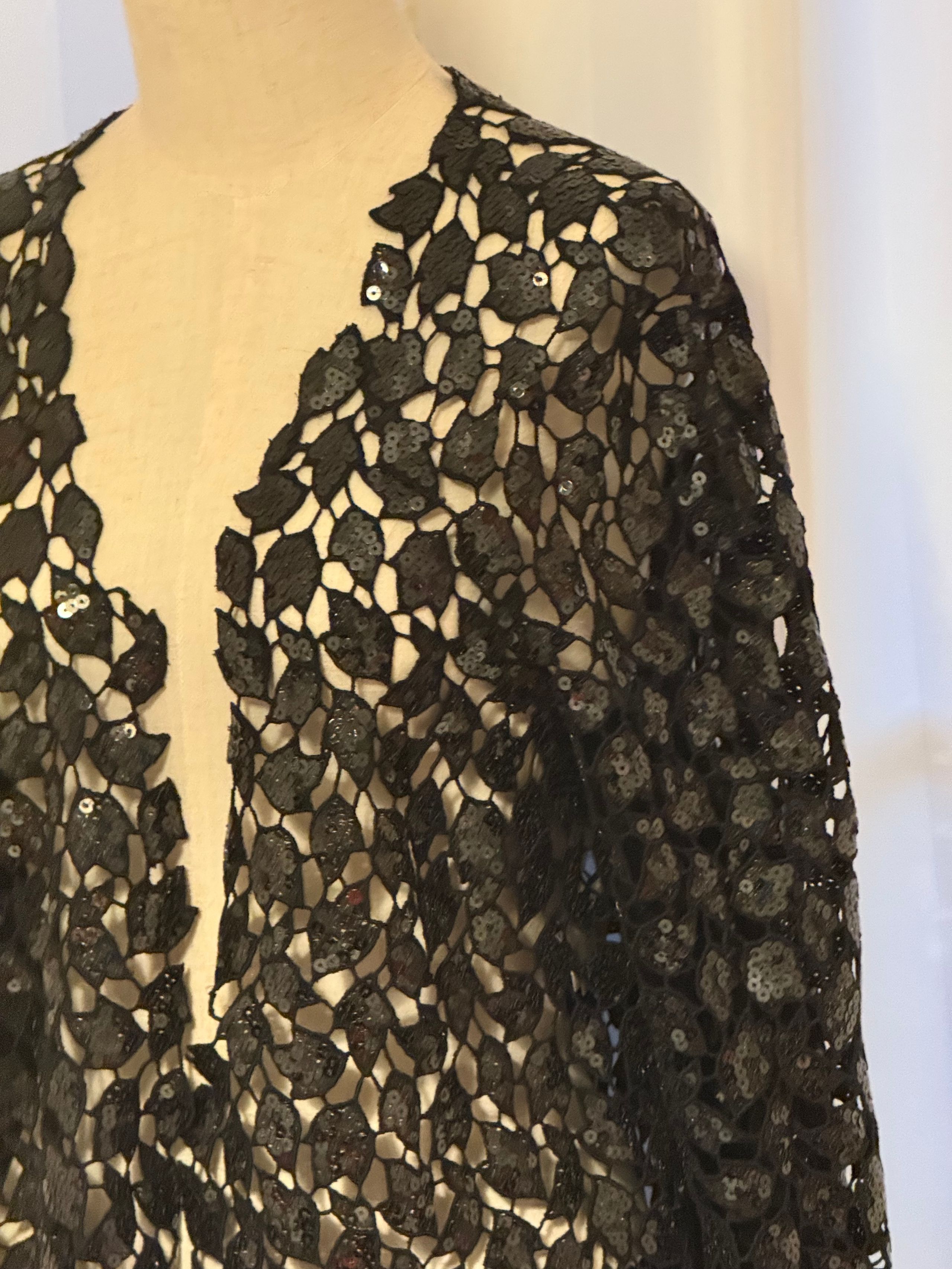 Veste courte, ample, manches trois quarts, sans couture, Dentelle de coton noire faite mains , re brodée de sequins. Taille 38 Expert : Madame Martine Lecamus.