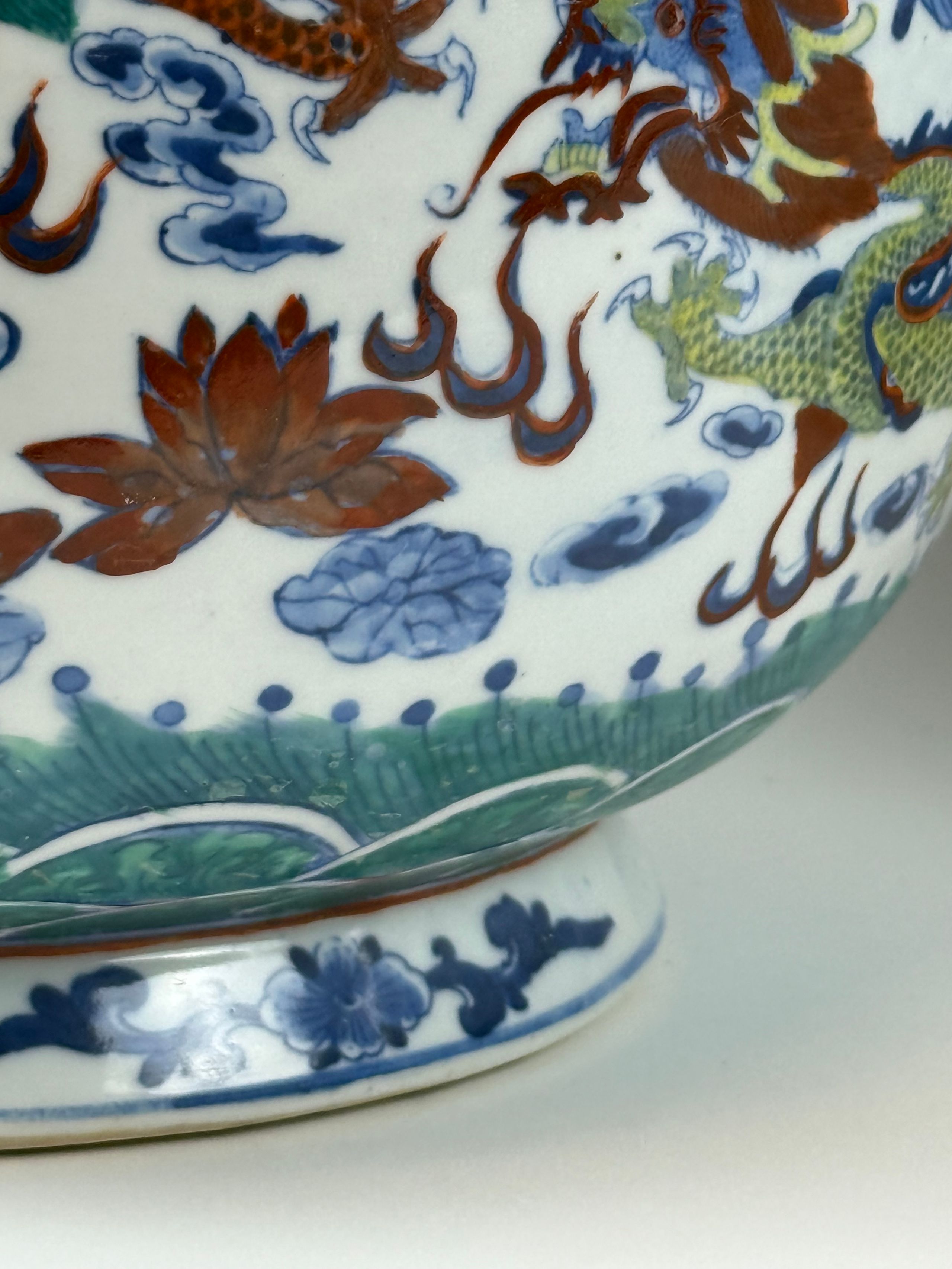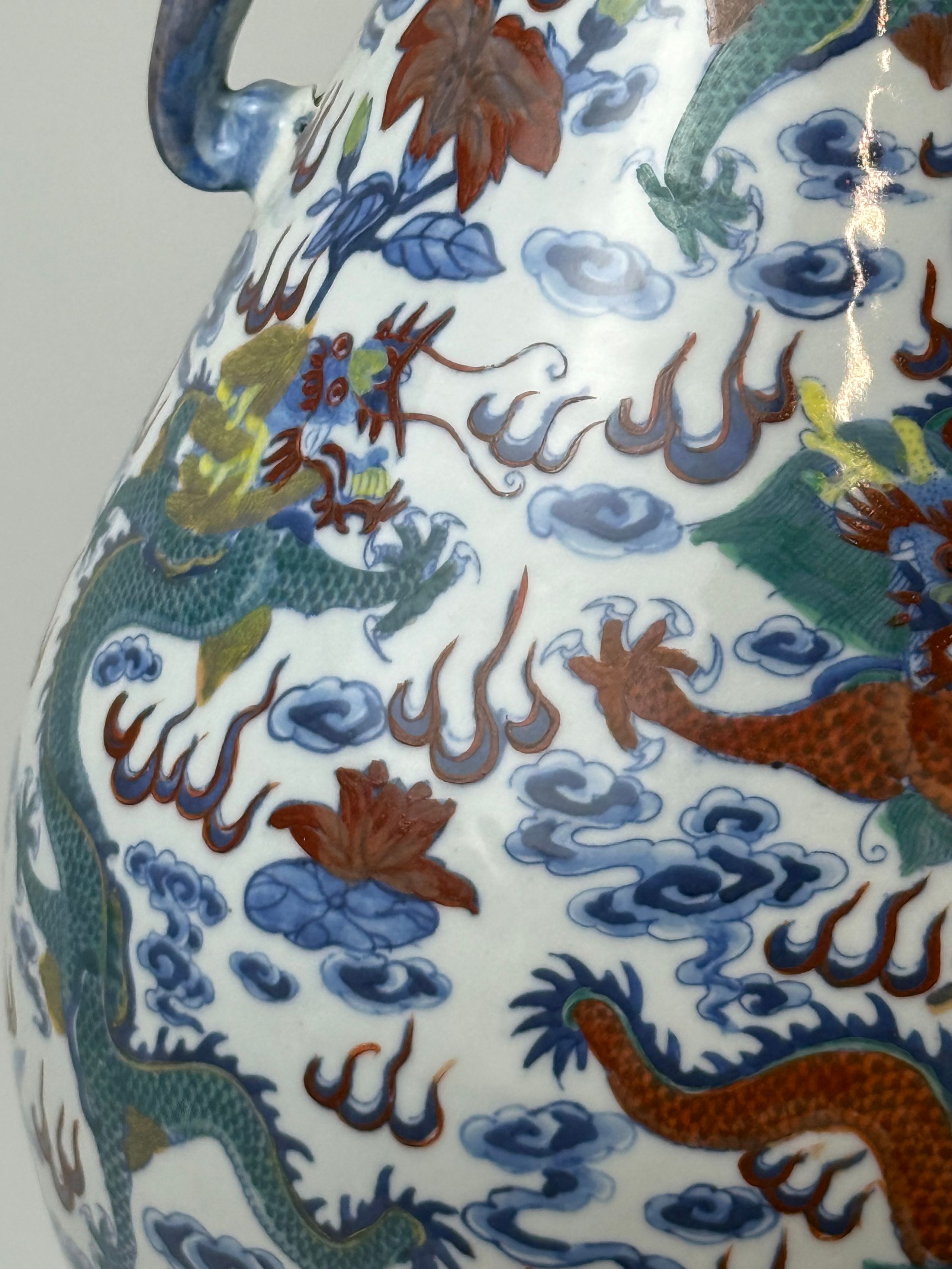 Paire de grands vases à panse basse en porcelaine décorée partiellement au pochoir en bleu sous couverte et émaux polychromes dits "wucai" (cinq couleurs) de neuf dragons pourchassant la perle sacrée parmi les nuages au-dessus de flots écumants. Deux anses en forme de têtes d'éléphants. Au revers, la marque apocryphe de Chenghua à quatre caractères en kaishu. (Petits accidents au talon de l'un). H. 49,5 cm
