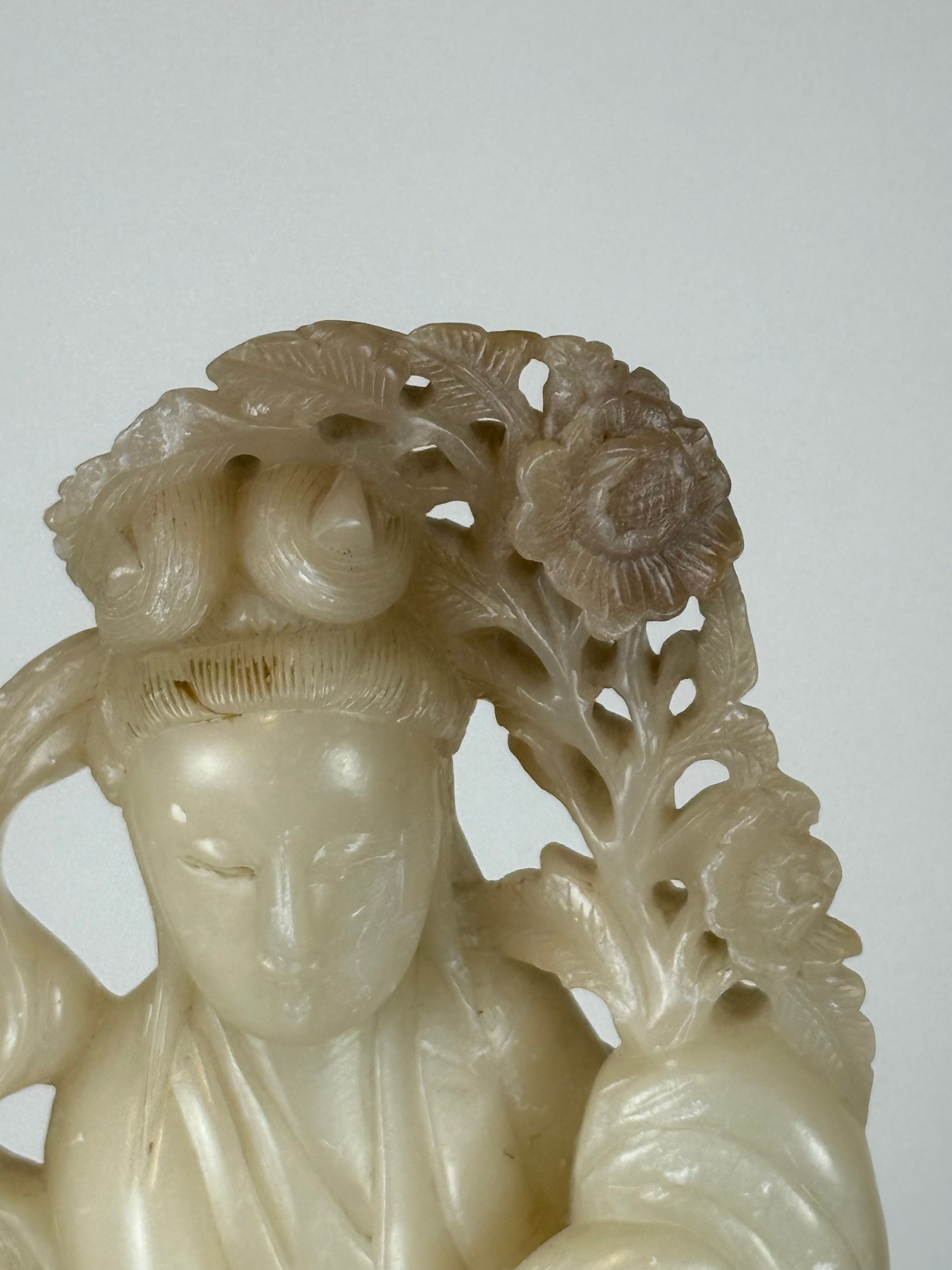 Grande statue en stéatite beige clair de Guanyin debout sur un socle en forme de lotus accompagnée d'un enfant tenant un vase fleuri et d'une grue tenant une branche de lingzhi. (Petits accidents). H. 50 cm