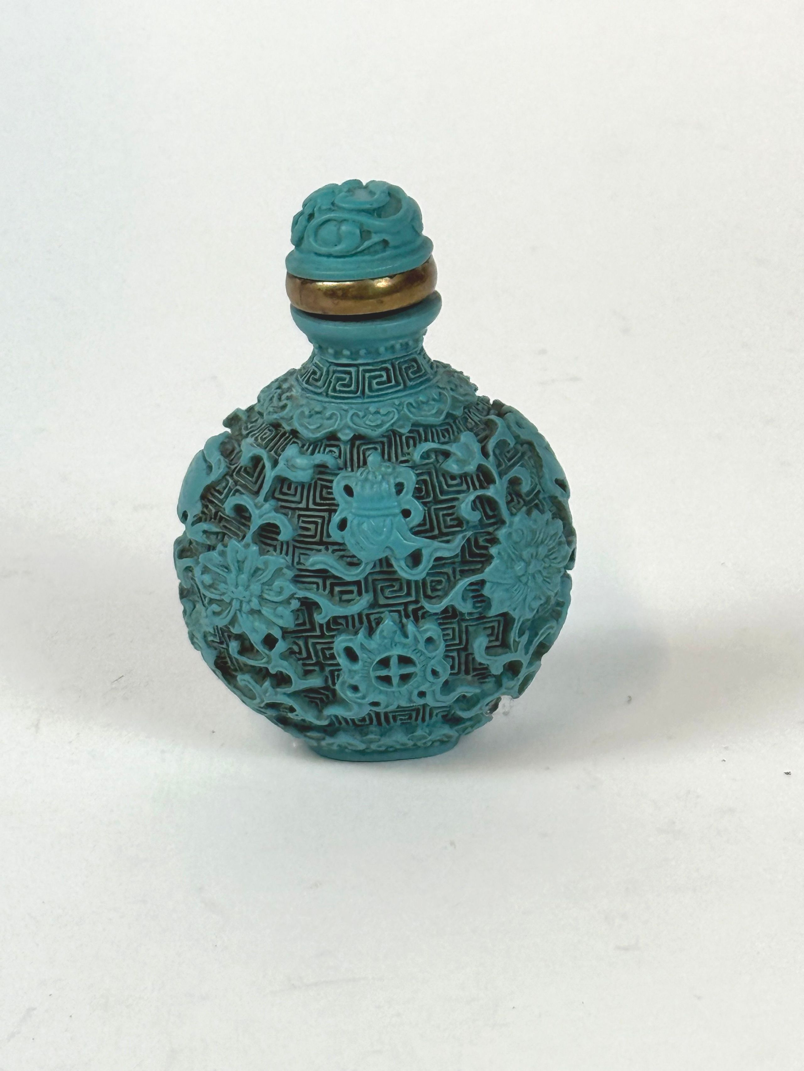 Flacon tabatière en résine imitant la turquoise à décor des huit symboles bouddhiques. H. 6,5 cm. Bouchon en résine. Expert : Cabinet Portier.