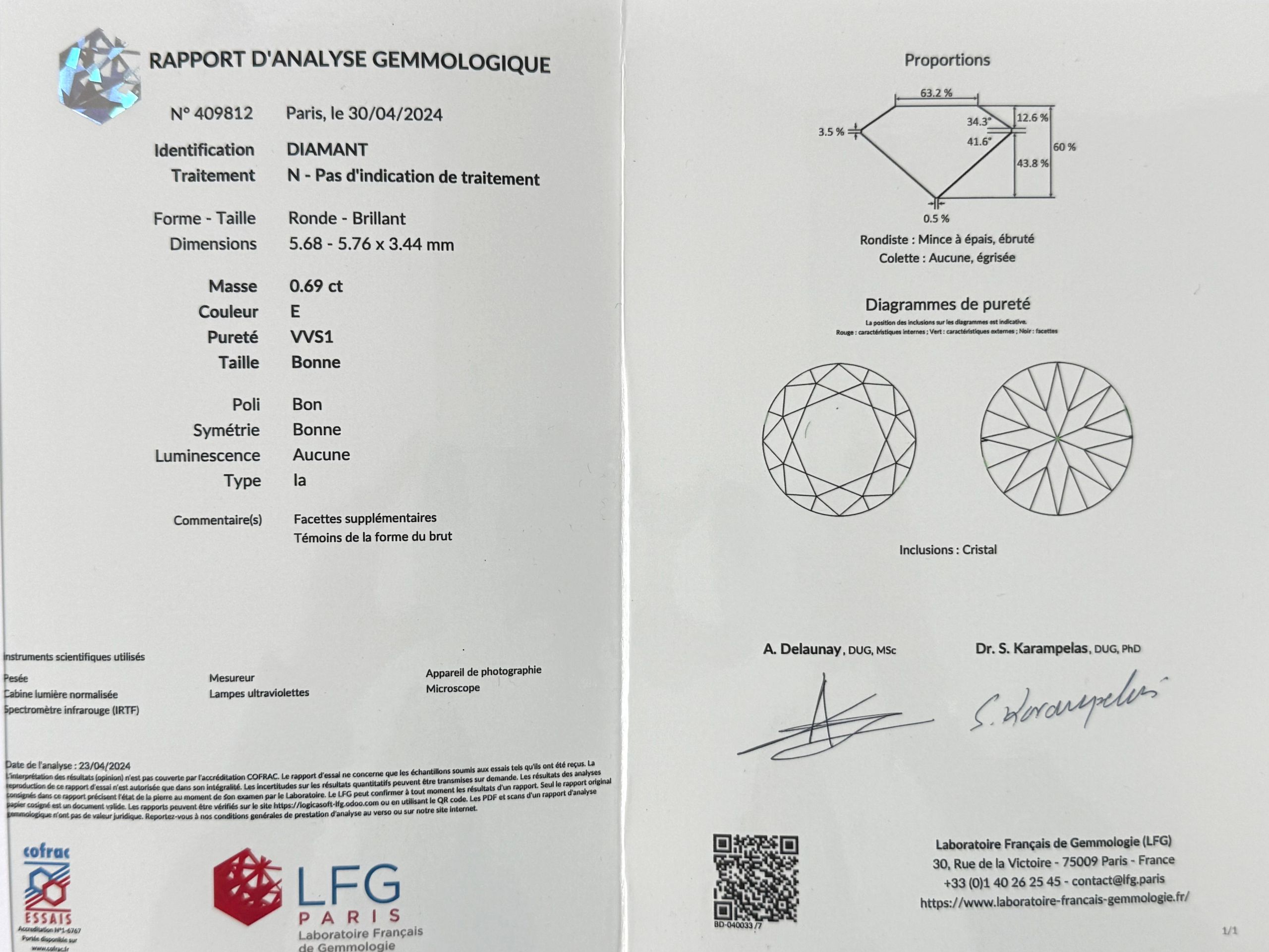 Accompagné d'un rapport d'analyse du LFG datant du 30 avril 2024 et indiquant : - Poids : 0,69 ct. - Couleur : E. - Pureté : VVS1. - Fluorescence : Aucune. - Taille : Bonne. - Poli : Bon. - Symétrie : Bonne.