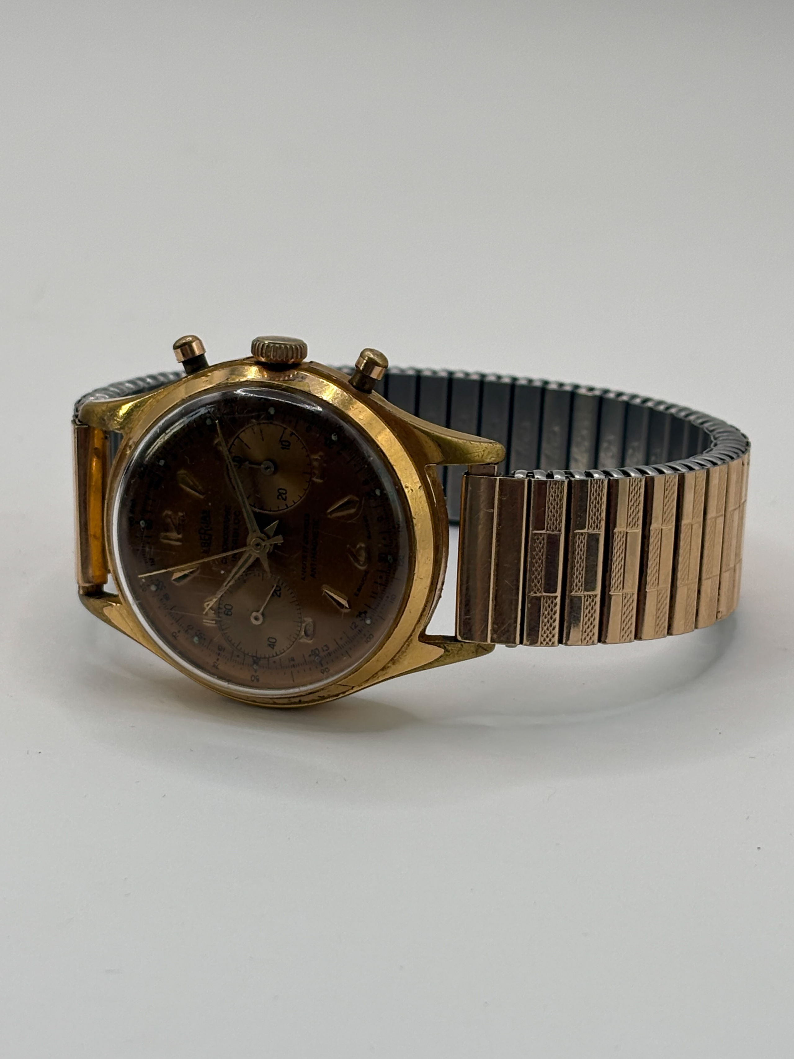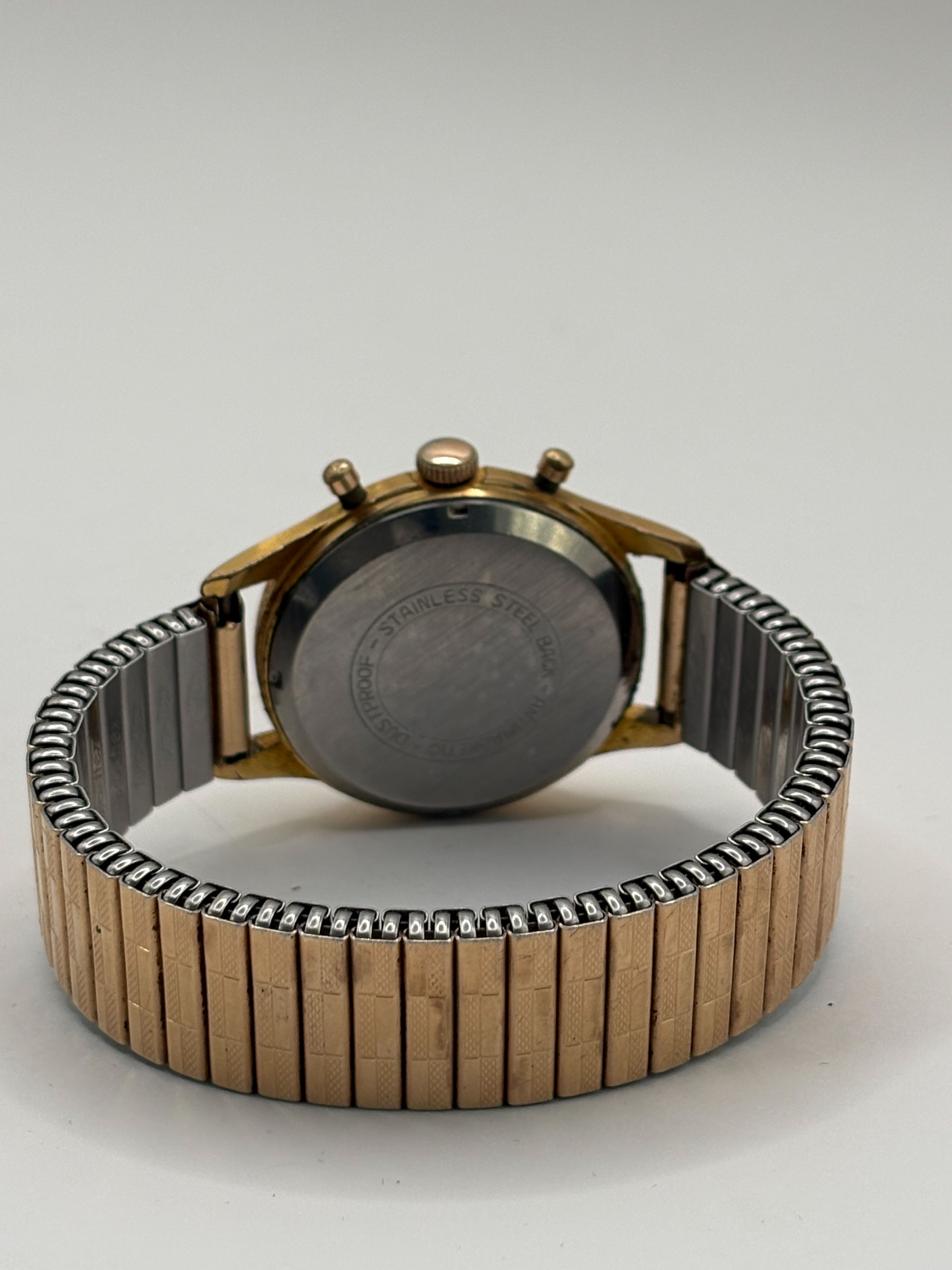 Montre bracelet, boîtier rond en métal, cadran à fond cuivré, chiffres arabes, index losangiques et deux sous cadrans.
