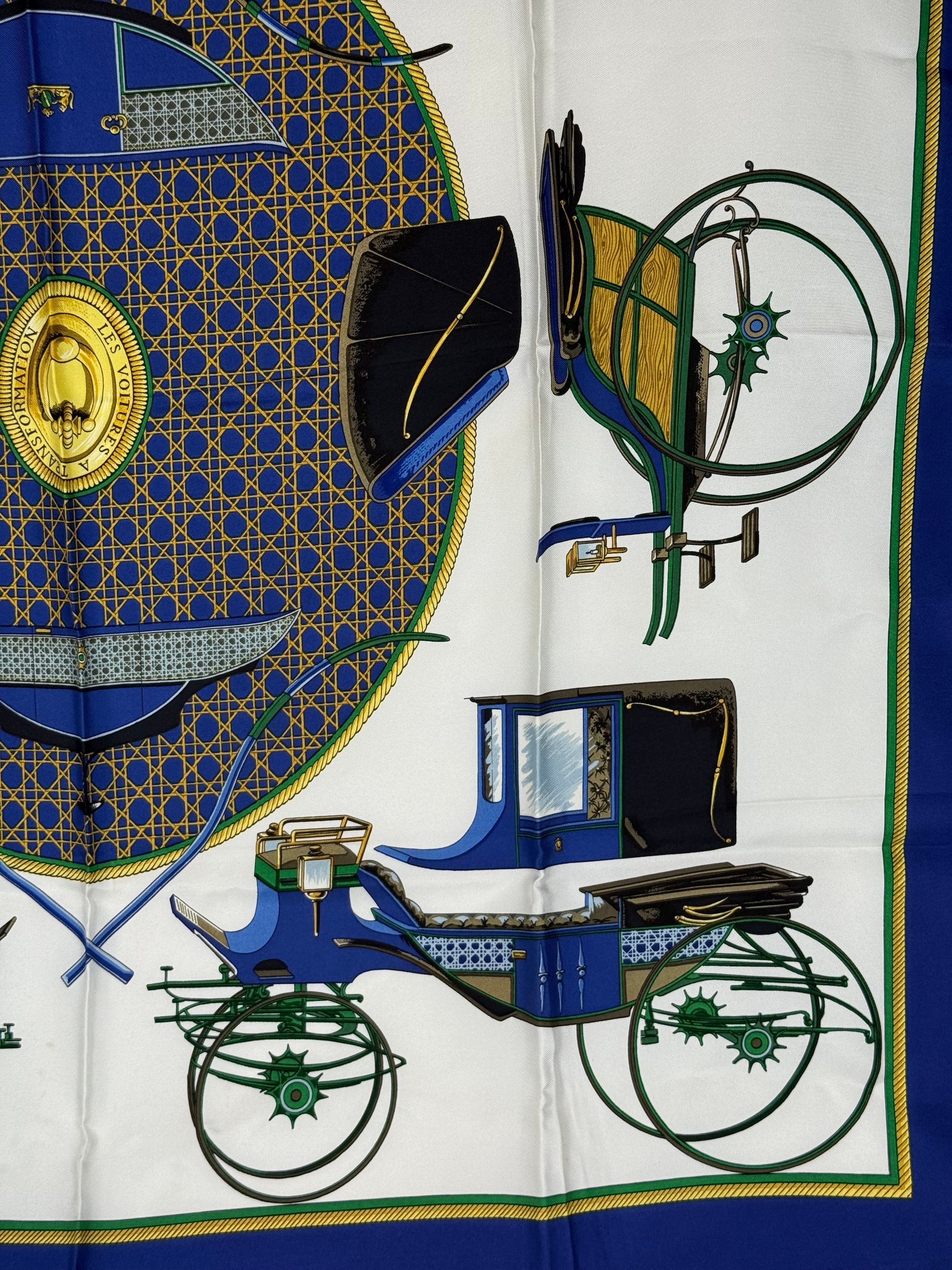 Carré en soie modèle Voitures à transformations, fond blanc et bordure bleue marine. Signé La Perrière (petites taches)