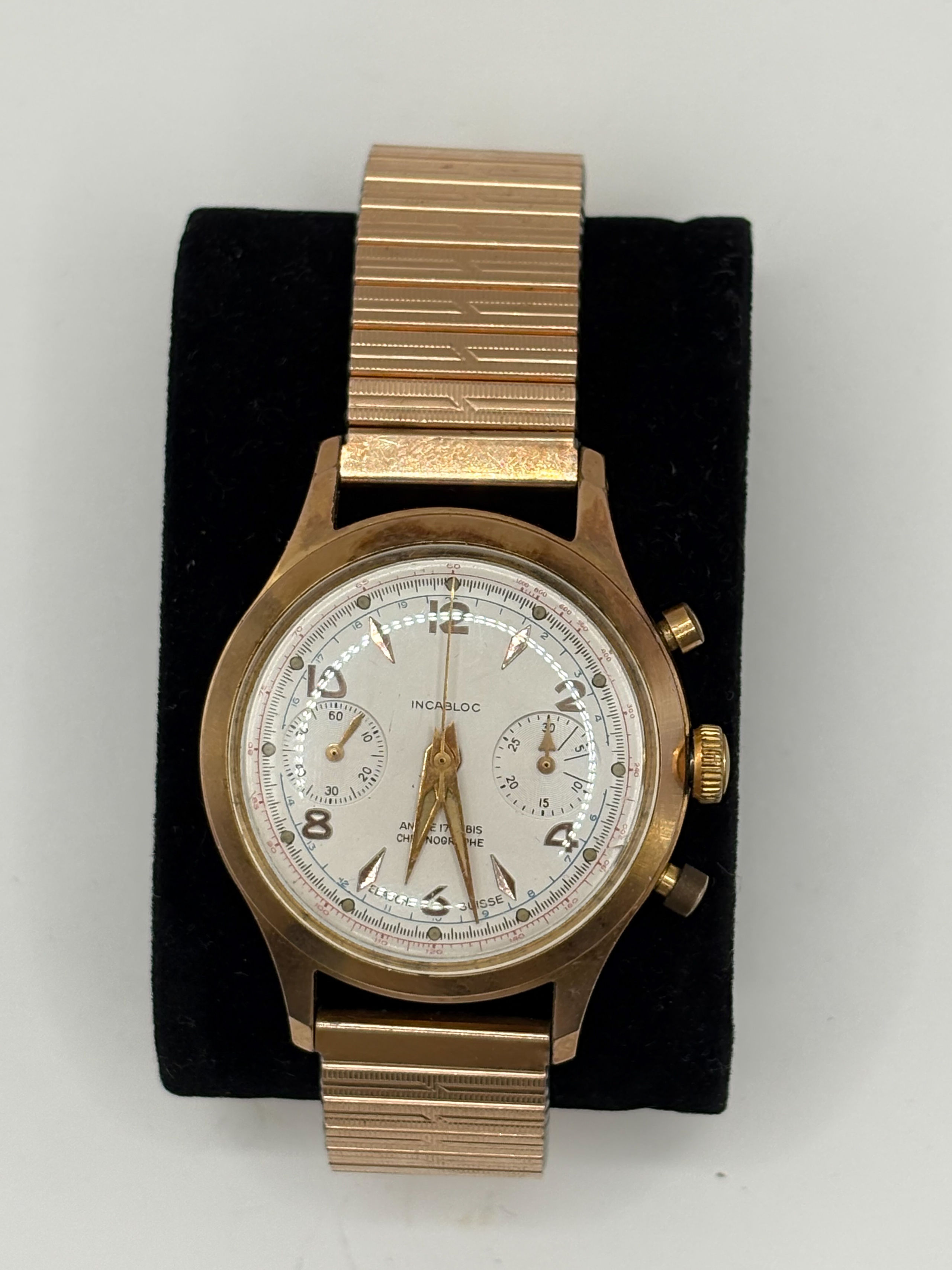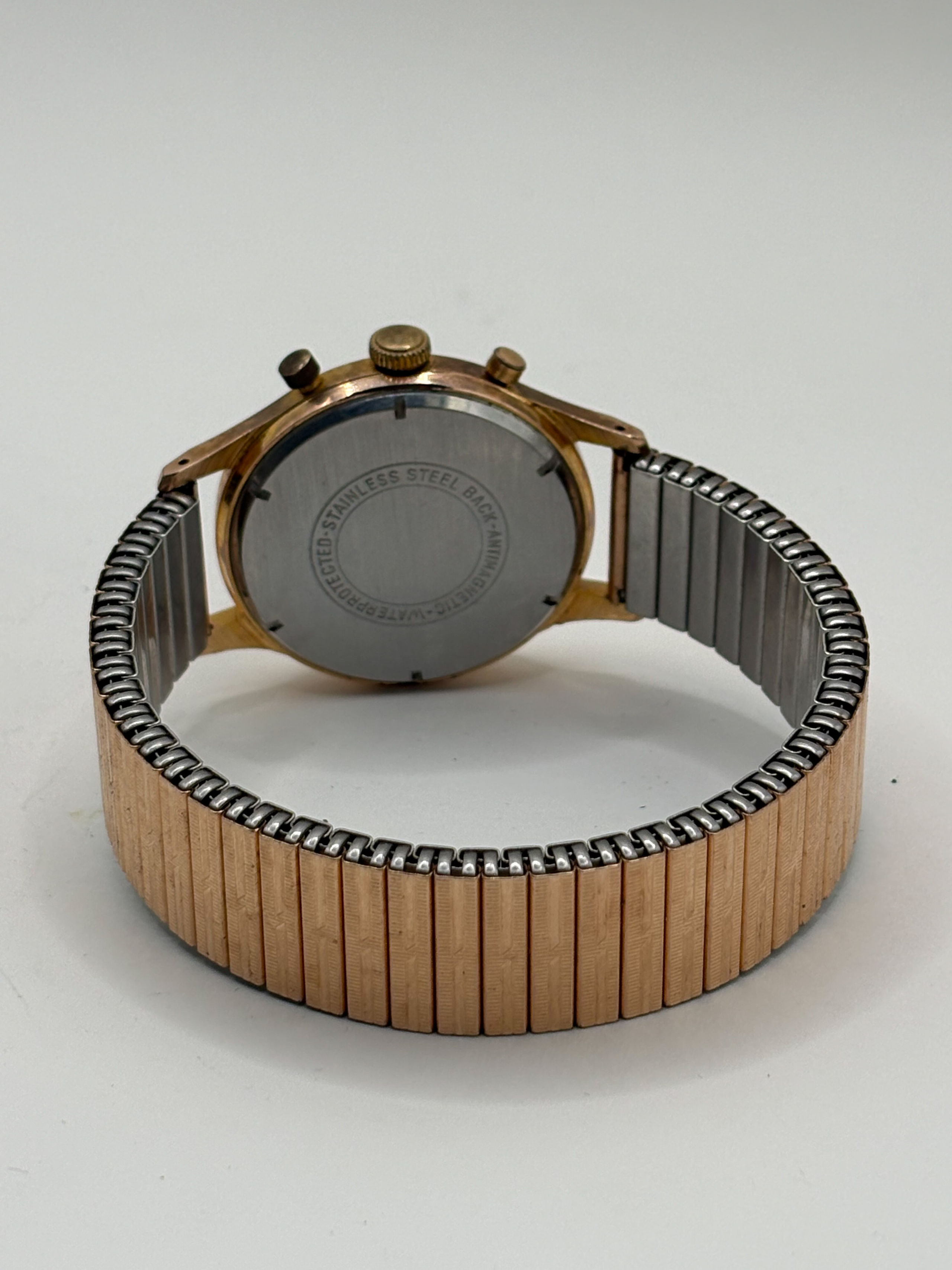 Montre chronographe bracelet, boîtier rond en métal doré, cadran à fond gris, chiffres romains, index losangiques et deux sous cadrans.