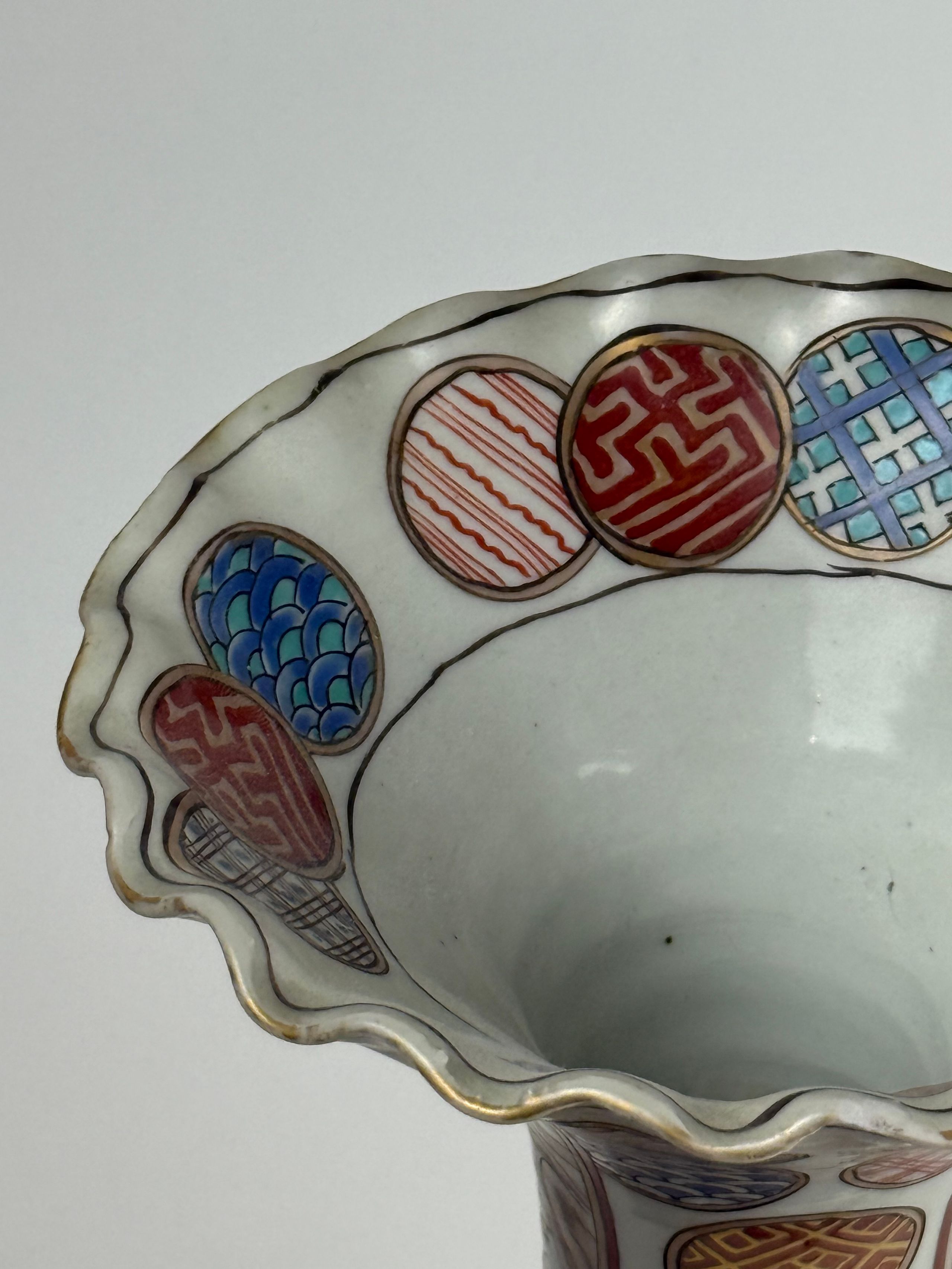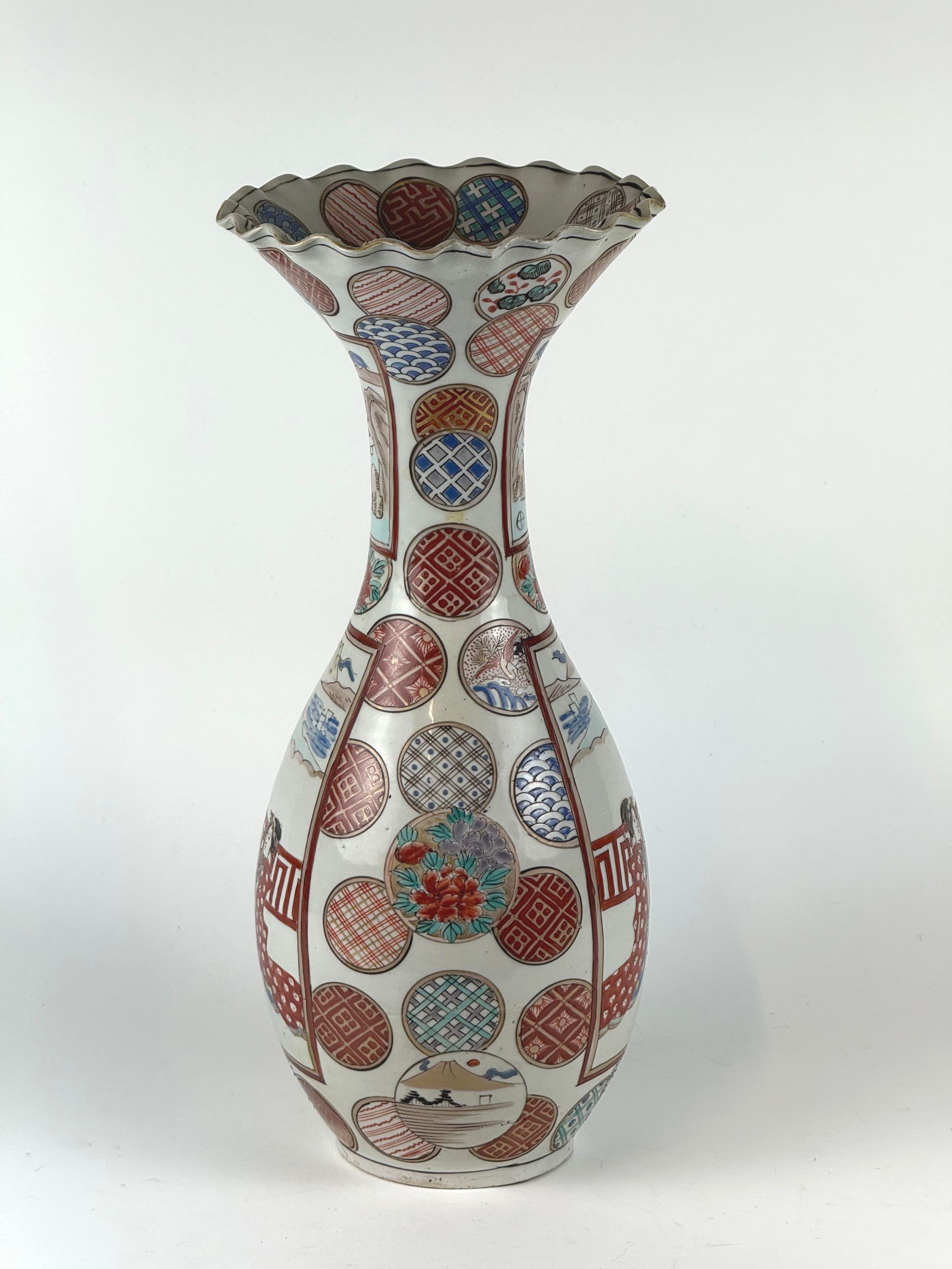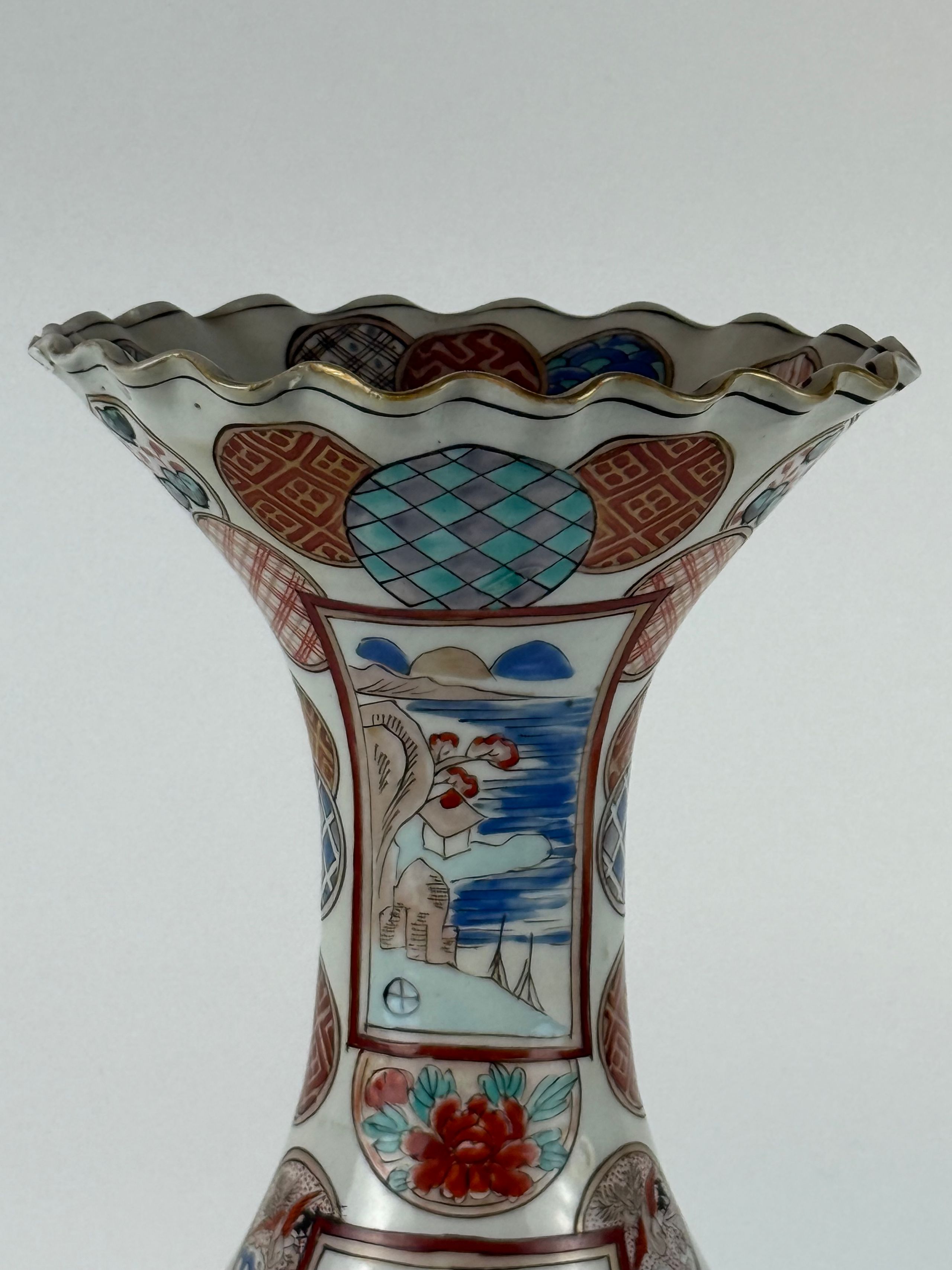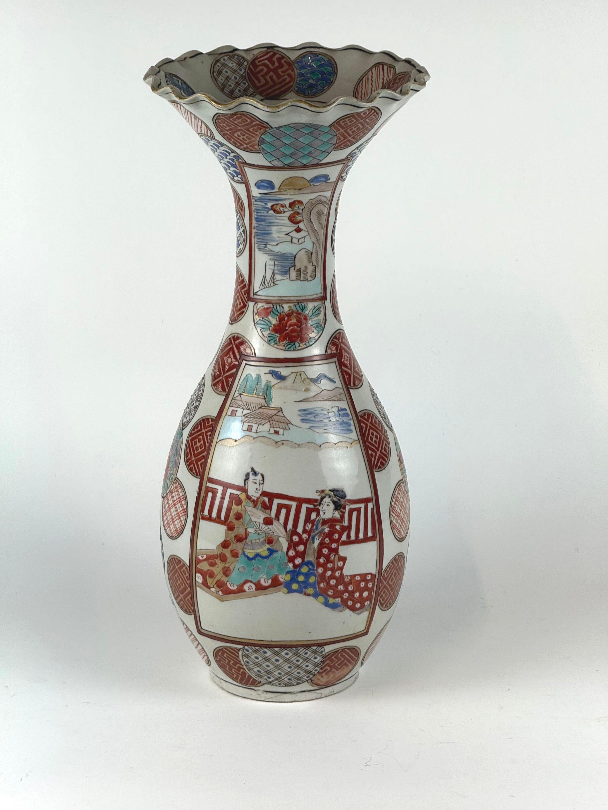 Vase balustre à col évasé et chantourné en porcelaine émaillée polychrome à décor d'un couple sur une terrasse devant le Mont Fuji et médaillons ornés de motifs stylisés. Au revers, la marque Hichozan Shinpo sei. H. 37,5 cm