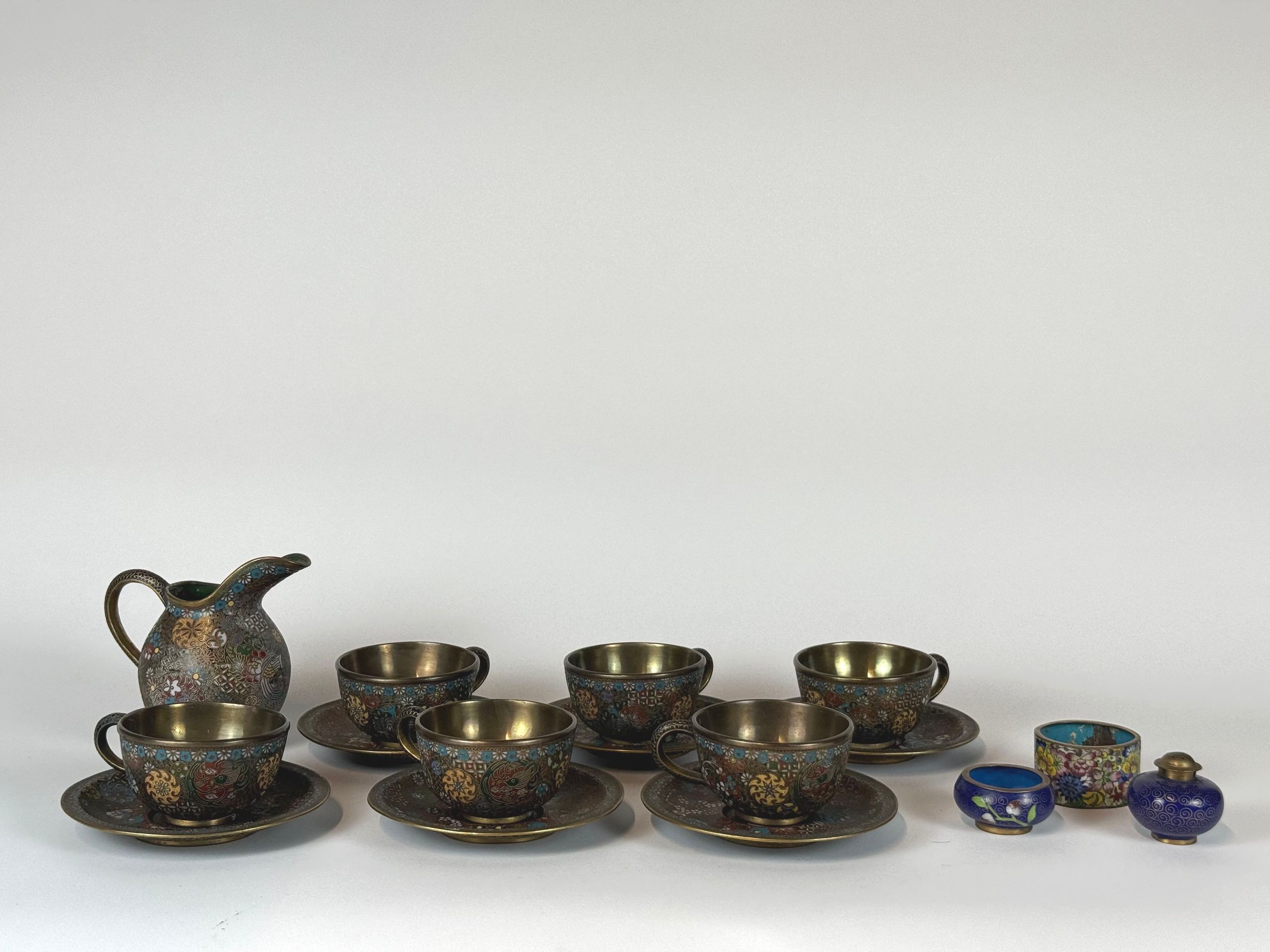 Service en bronze et émaux cloisonnés composé d'un pot à lait, six tasses et six soucoupes à décor de phénix parmi les fleurs. H. pot 1à,5 cm; Diam. coupe 12 cm