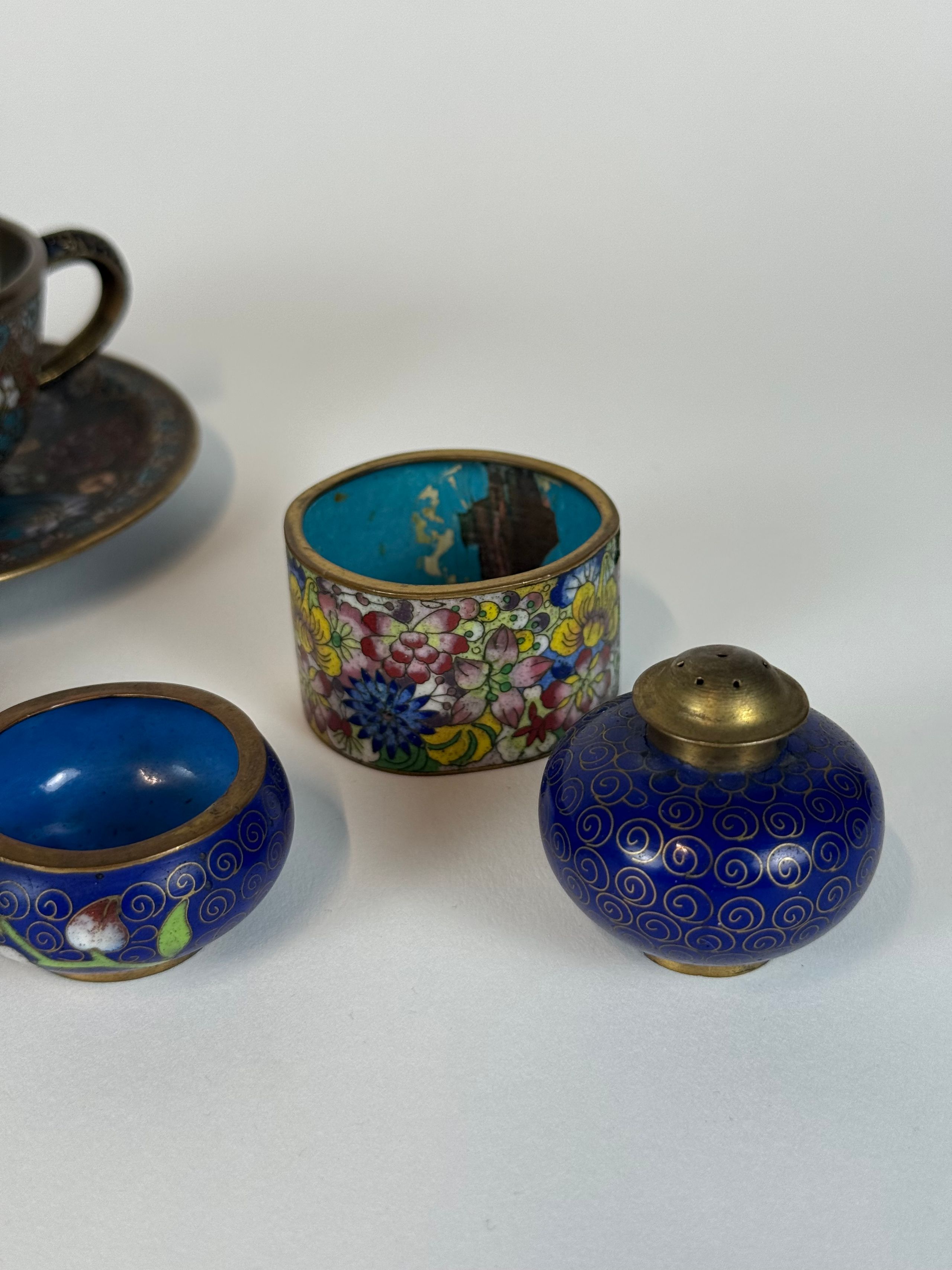 On y joint un rond de serviettes, un petit pot et une salière en cloisonnés. Chine