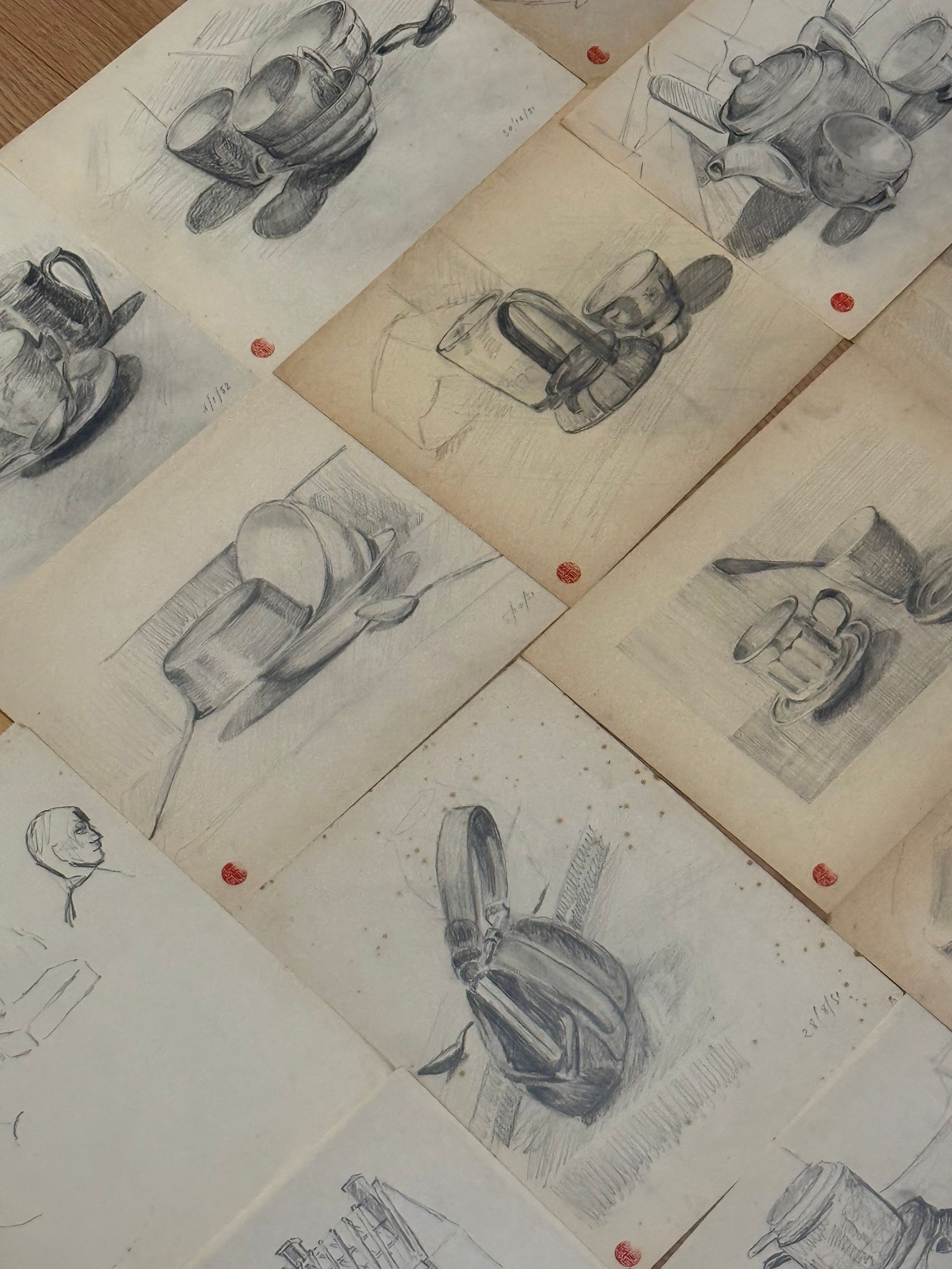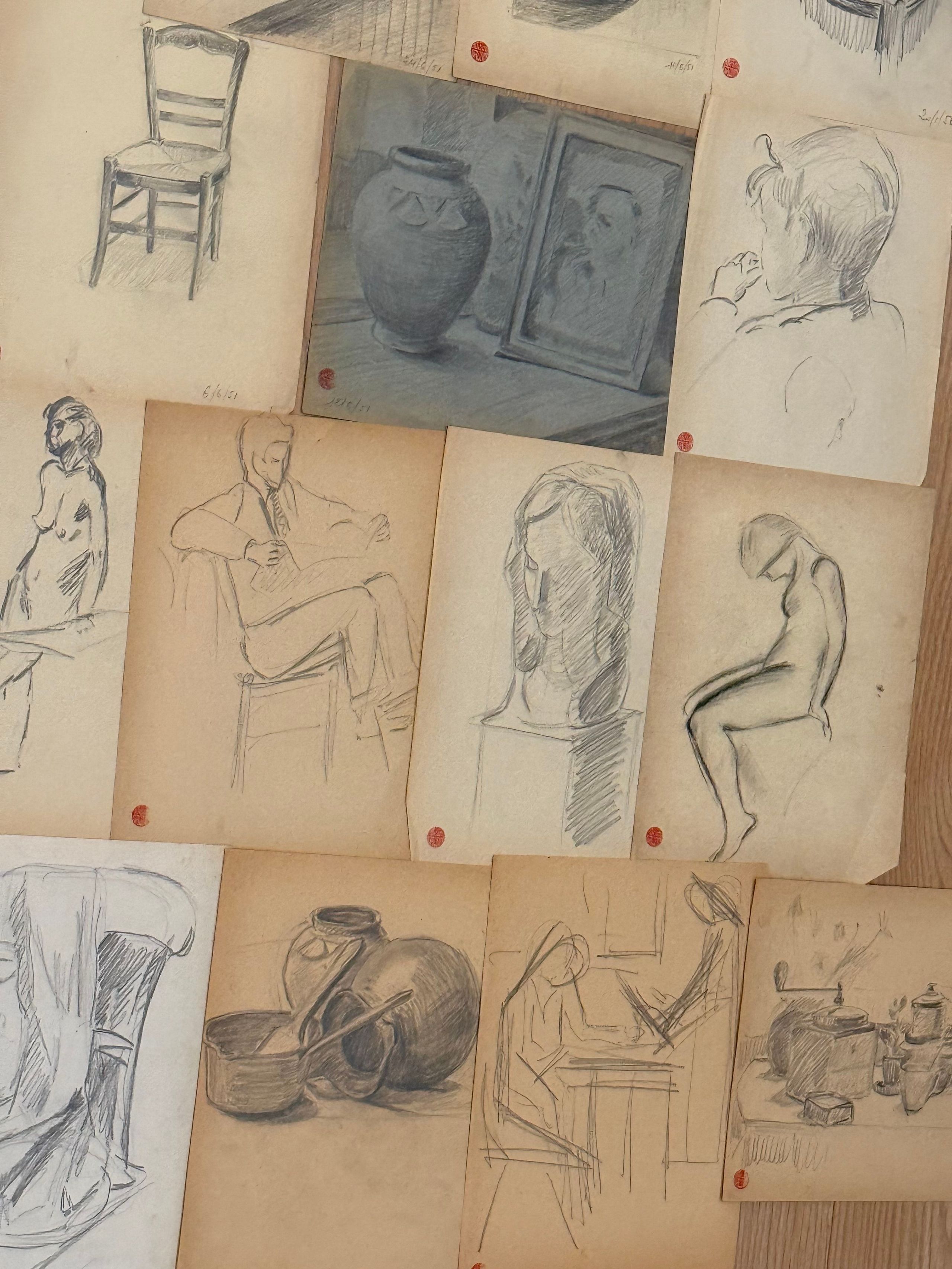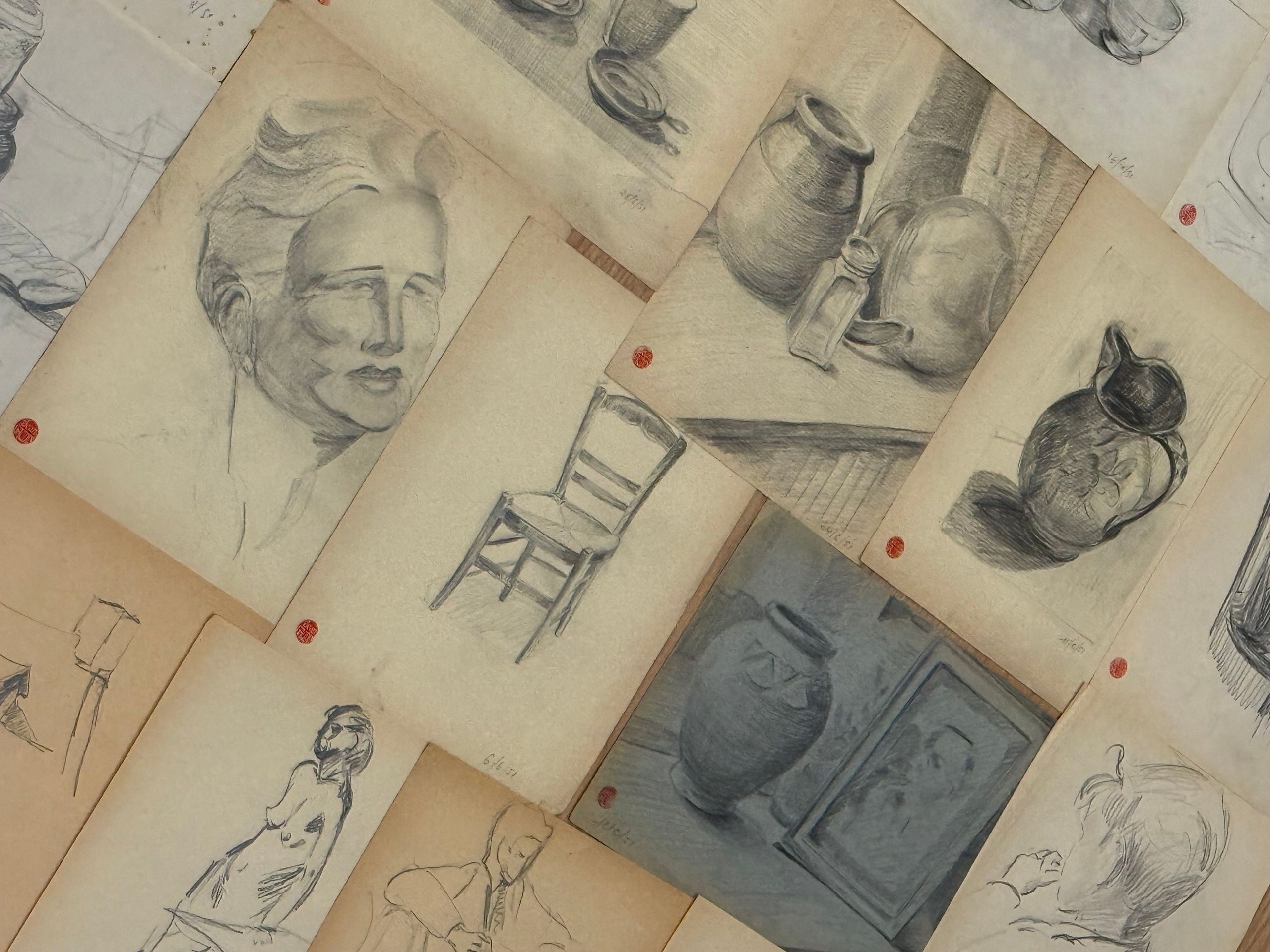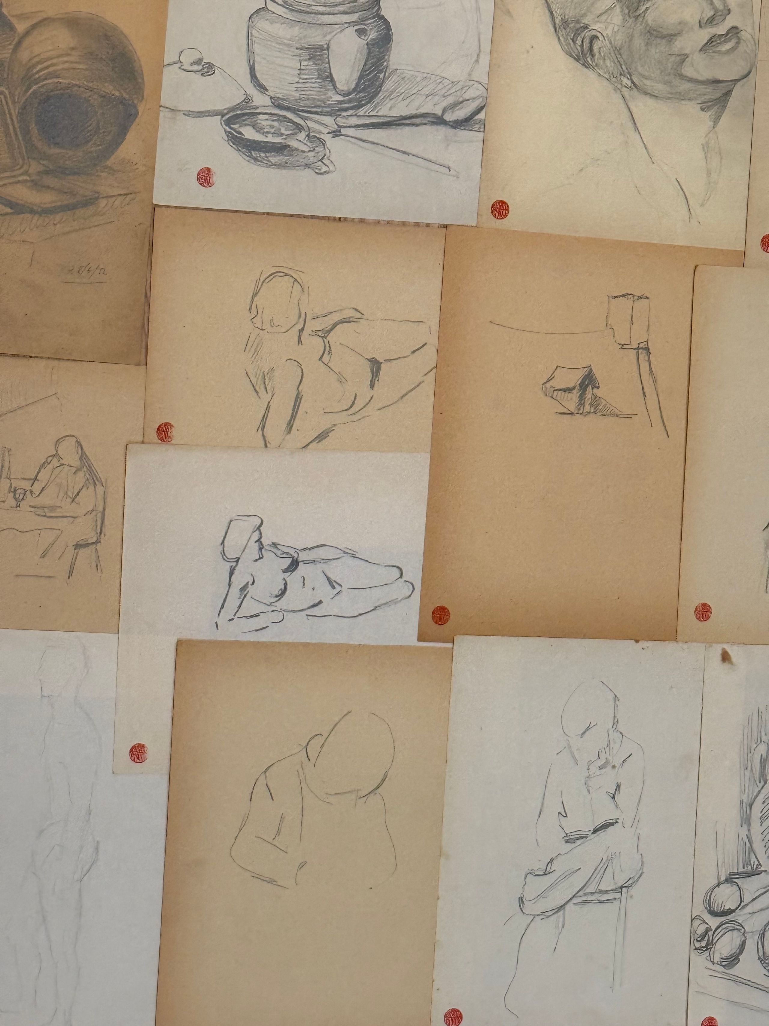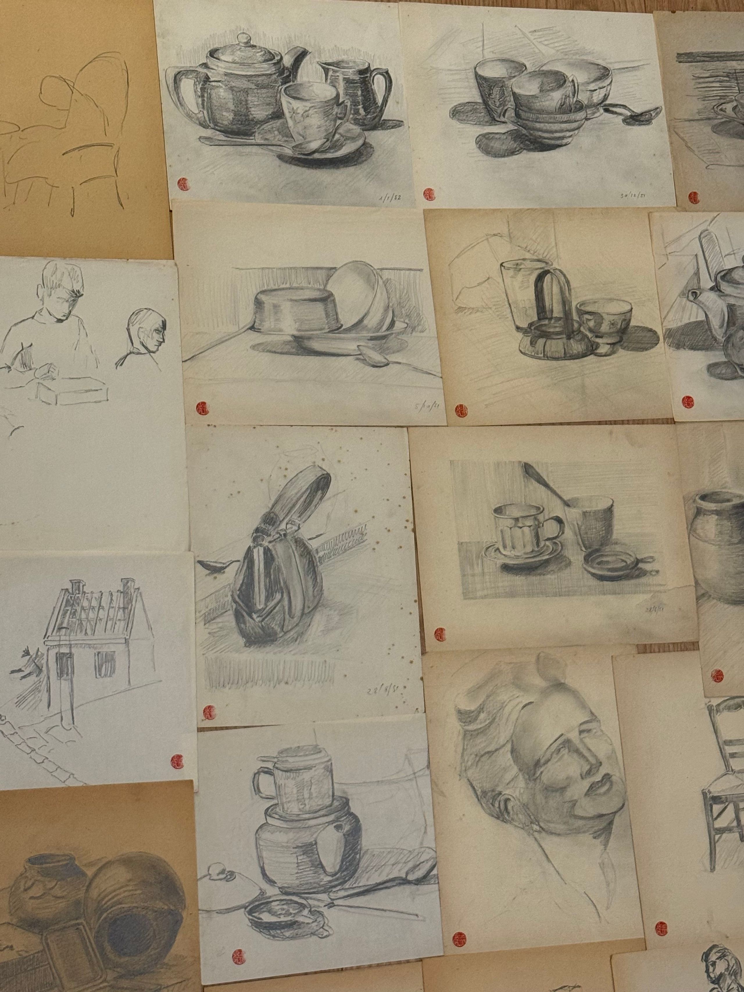 Lot de trente croquis environ représentant des natures mortes, portraits et nus. Mine de plomb. 27 x 21 cm environ.