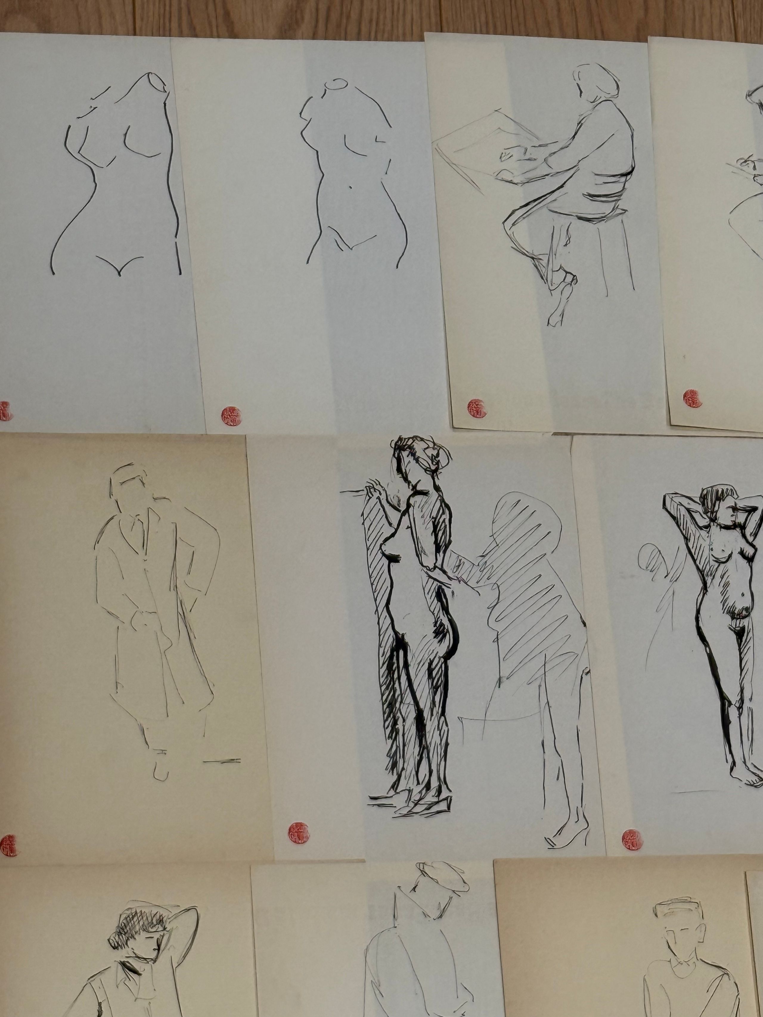 Lot de vingt croquis représentant des nus, portraits et scènes quotidiennes. Encres. 27 x 21 cm environ.