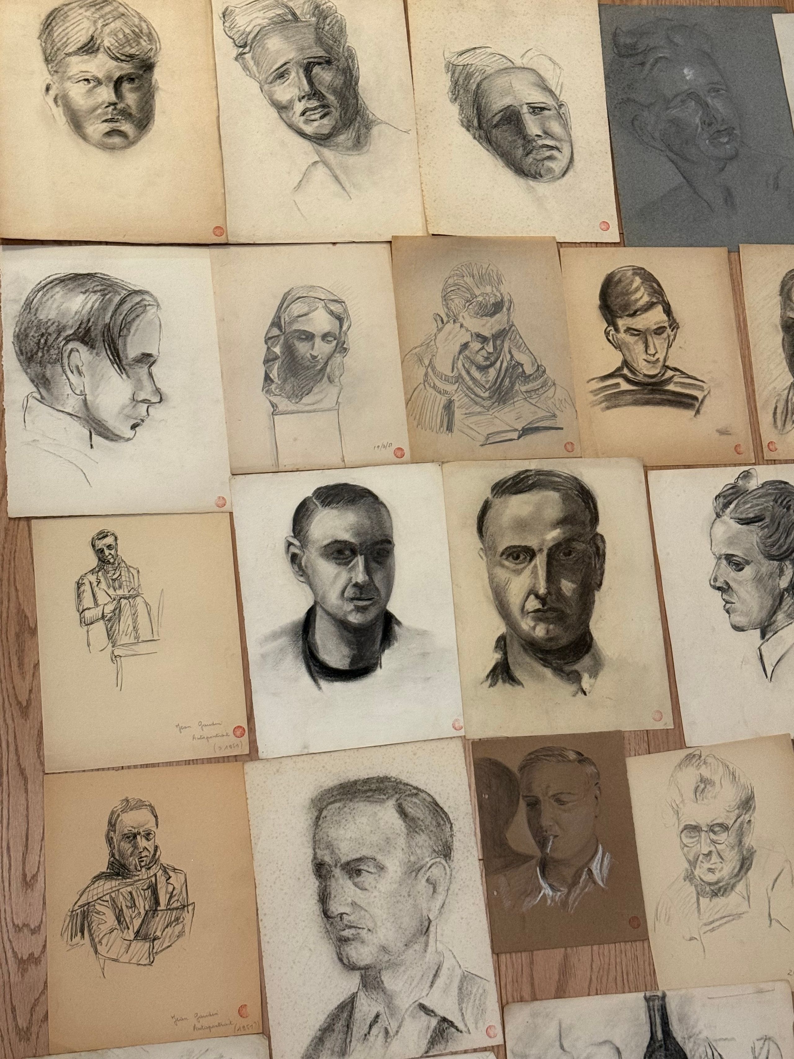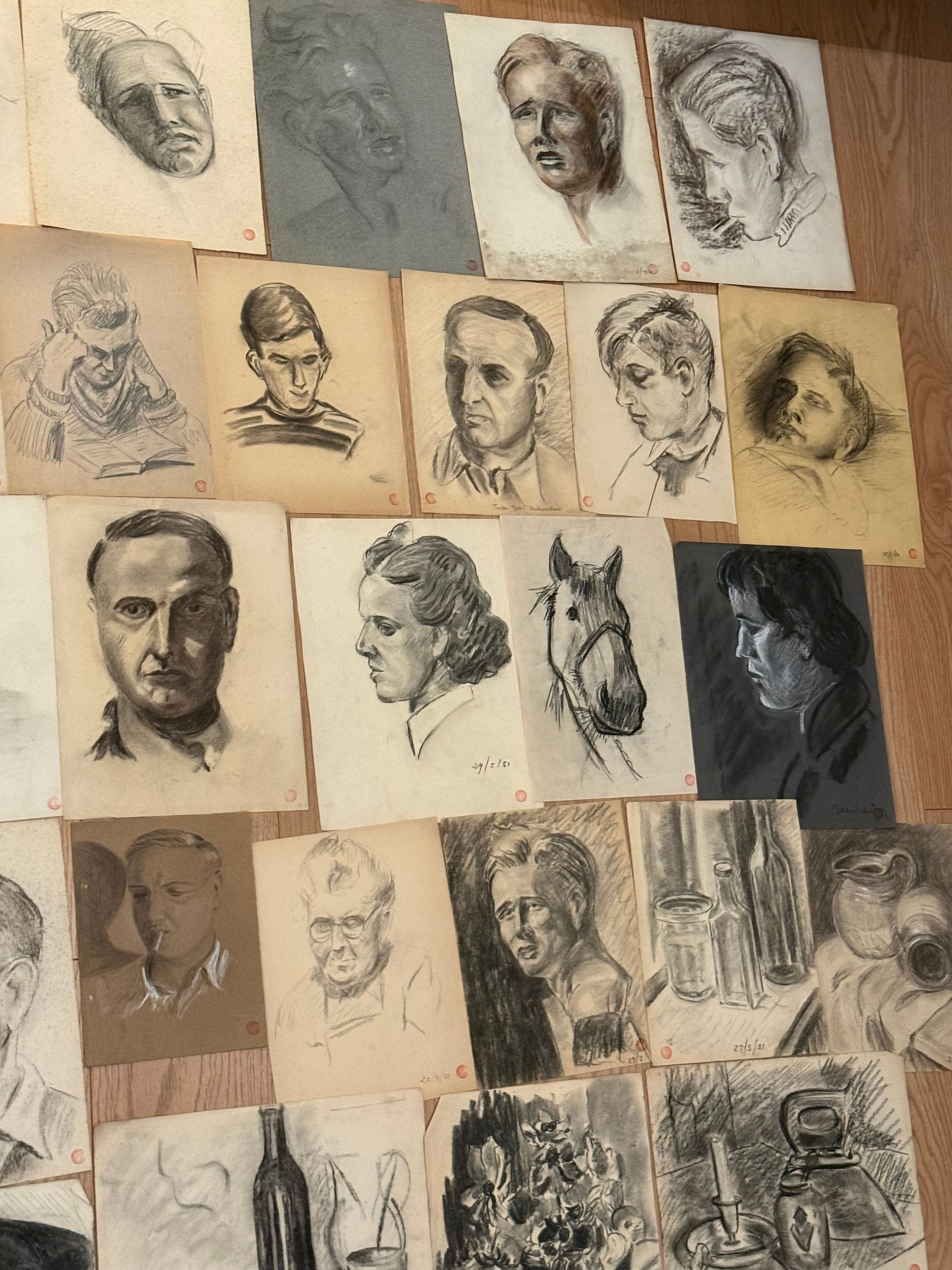 Lot de trente-cinq dessins environ représentant des portraits et natures mortes. Fusains majoritairement. 27 x 21 cm et 24 x 32 cm.