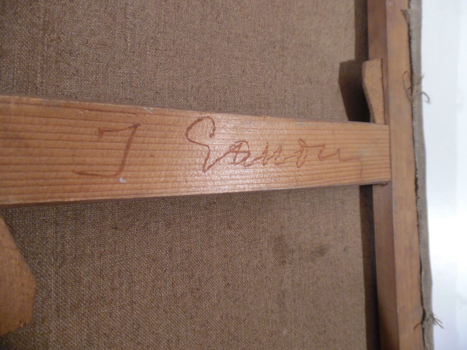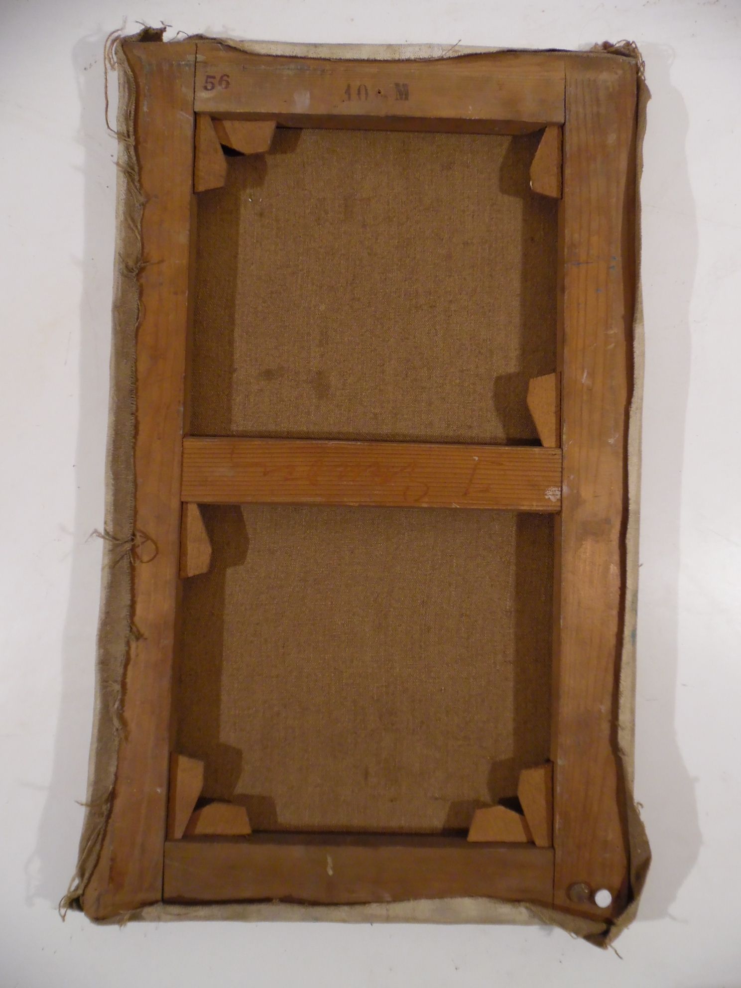 Maisons au bord du canal. Huile sur toile signée au dos. 55 x 33,5 cm.