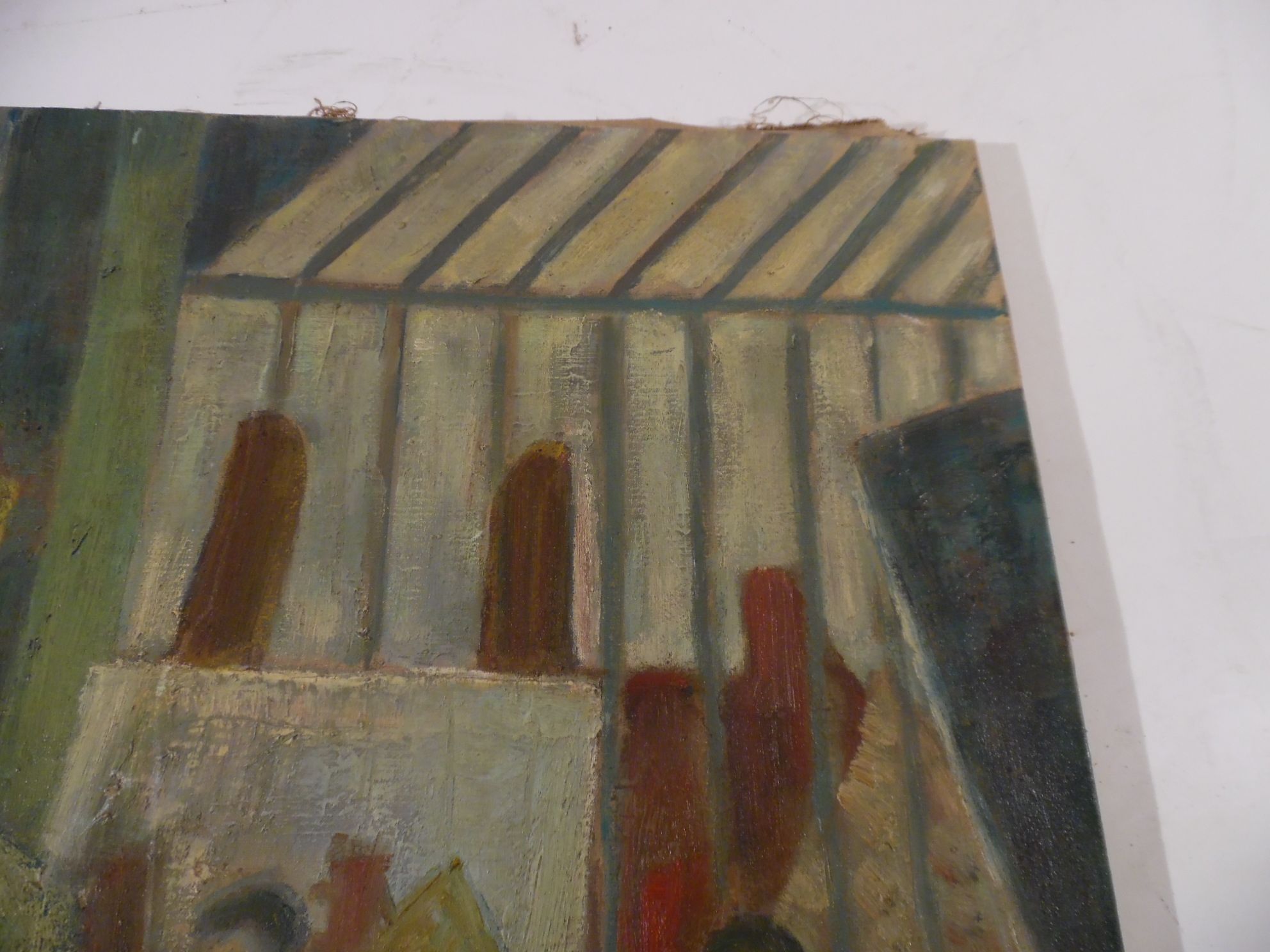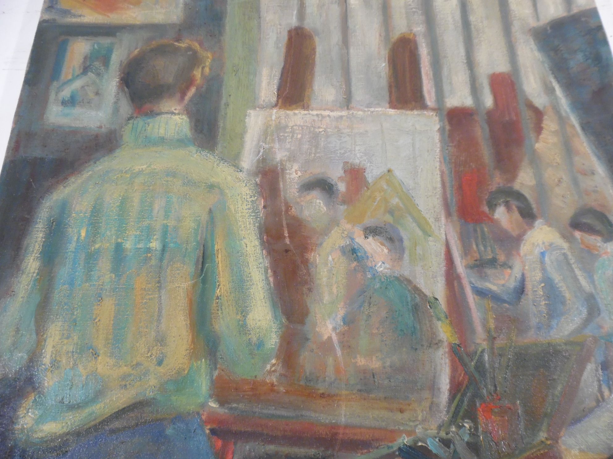 Peintres dans l'atelier Duhem. Huile sur toile signée en bas à droite et au dos. 81 x 60 cm.