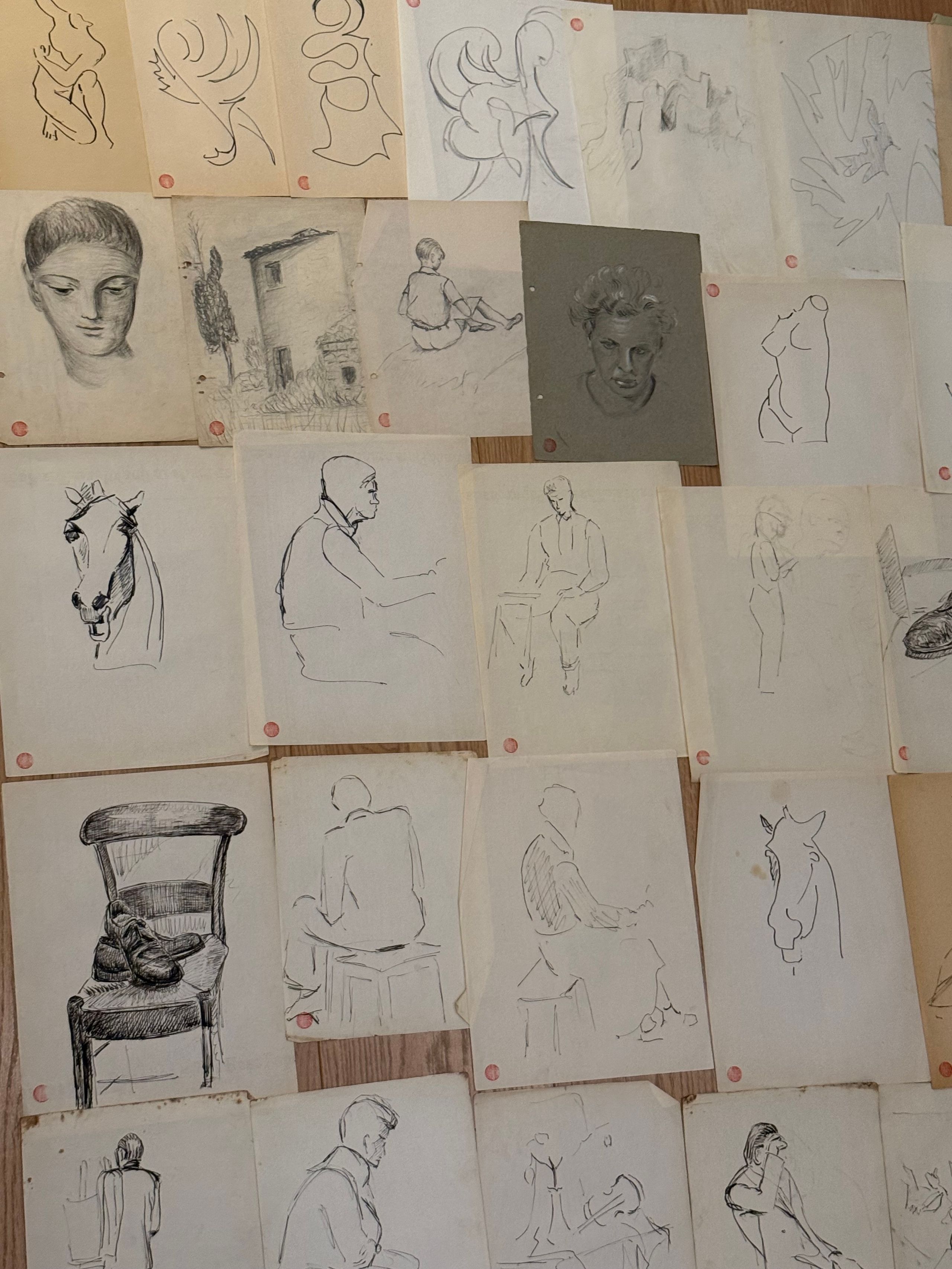 Lot de quarante dessins environ représentant des sujets divers : nus, portraits, paysages. Mine de plomb, encre, stylo bille. 27 x 21 cm environ.