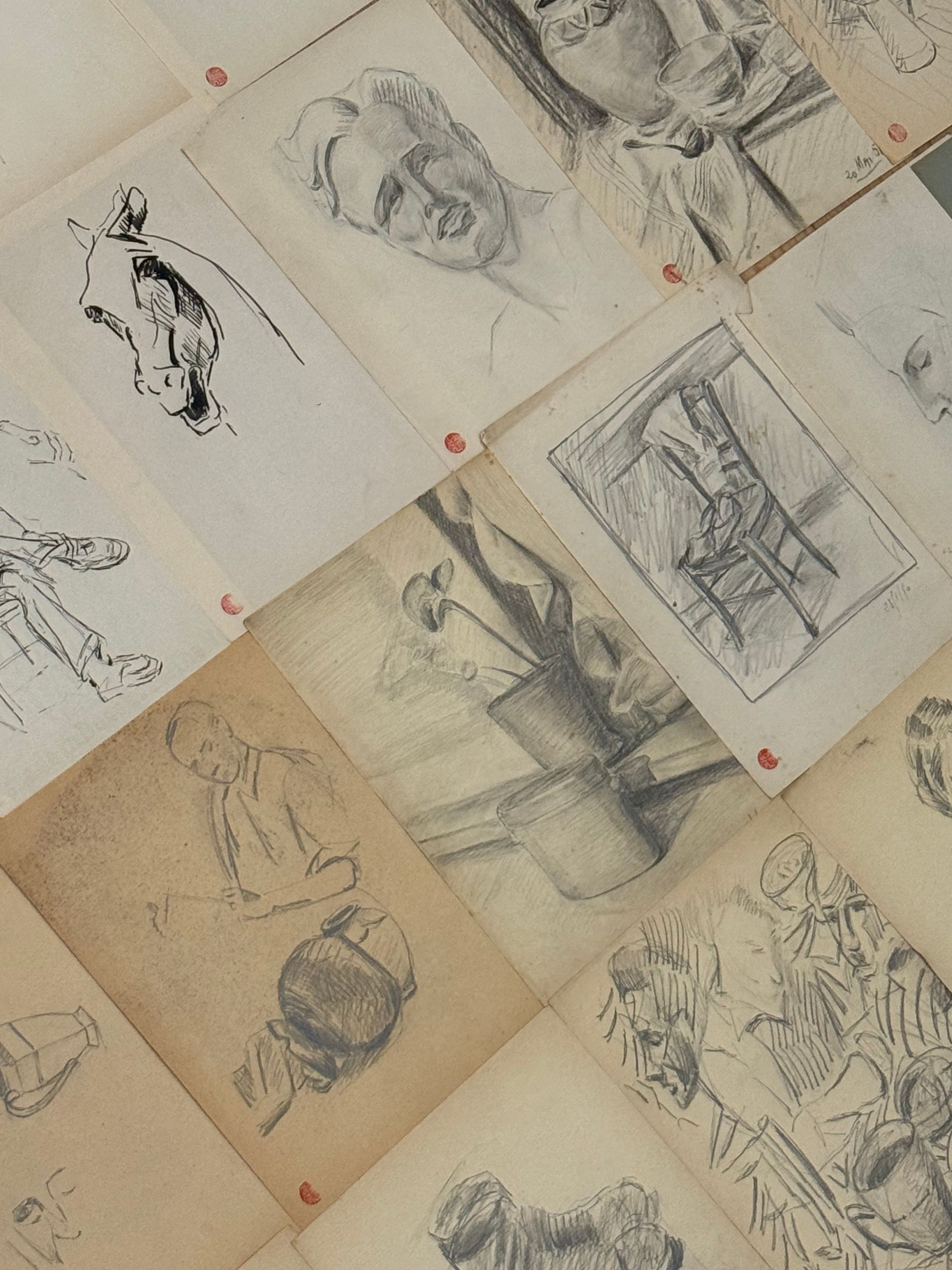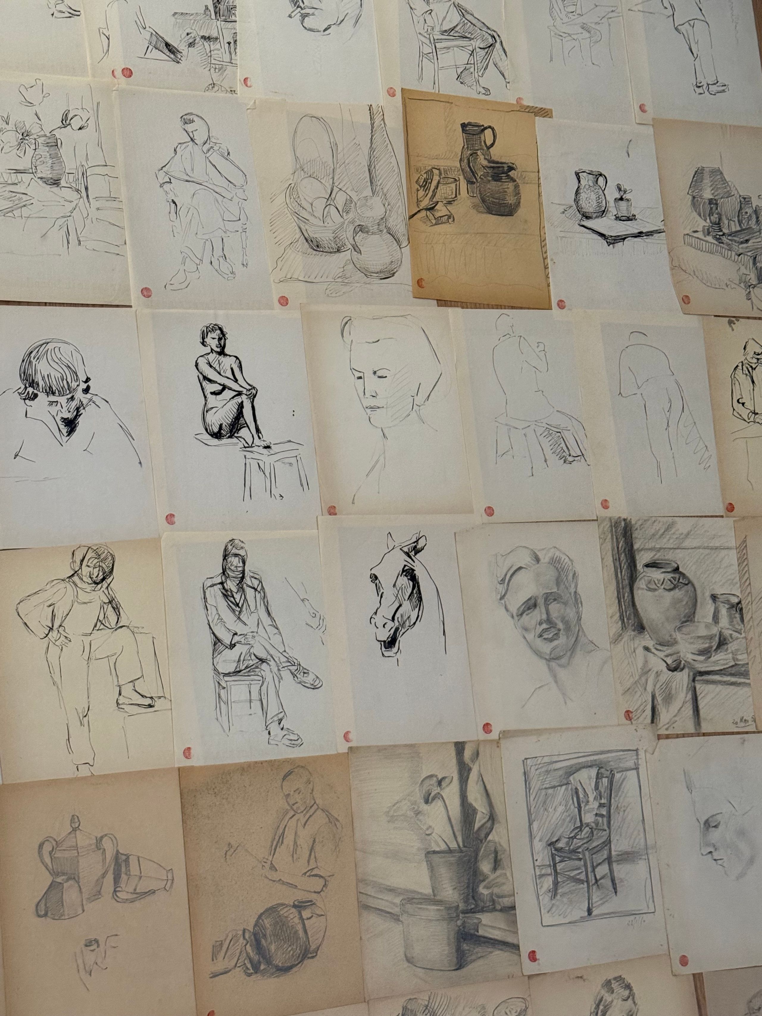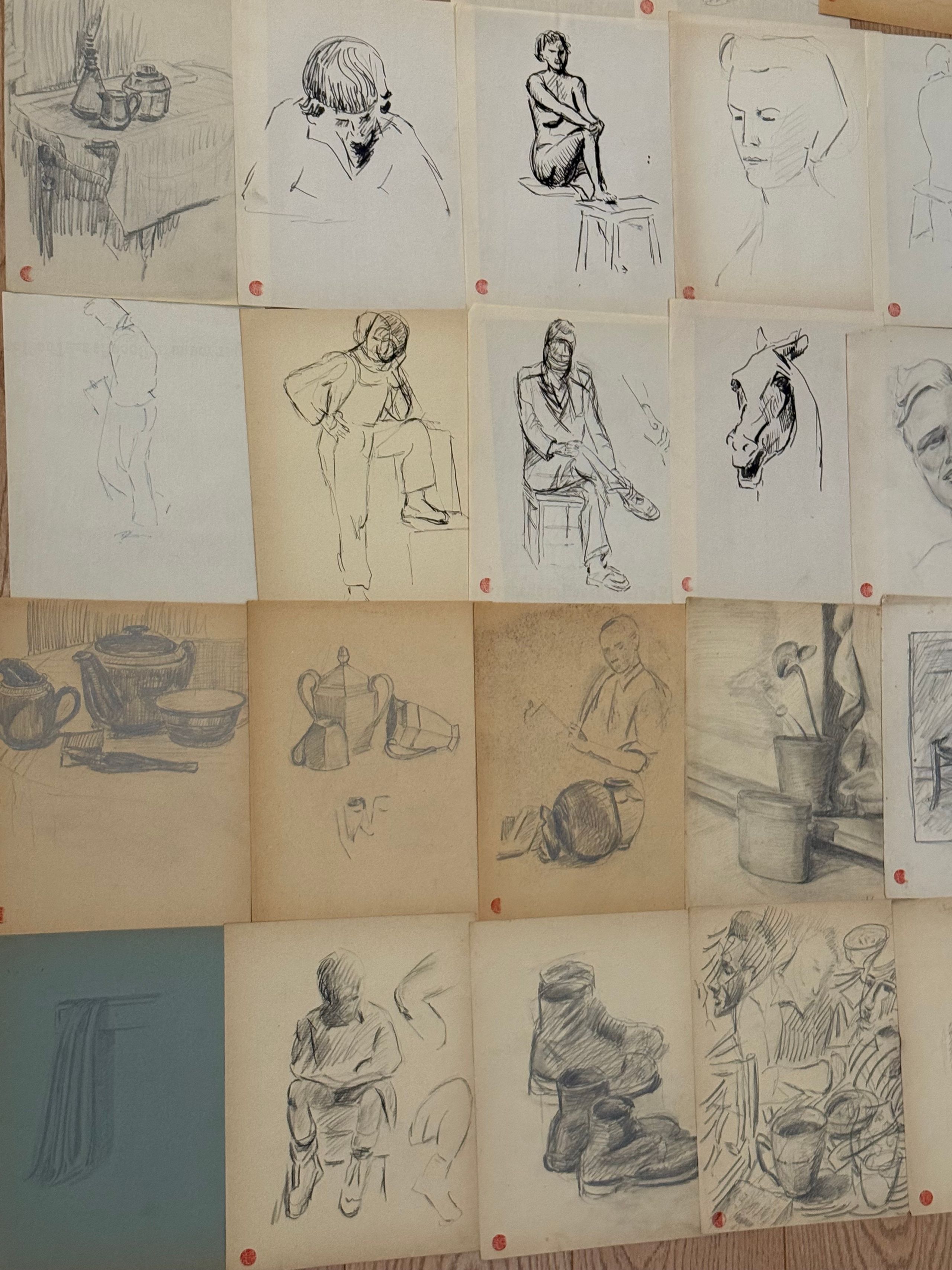 Lot de quarante croquis environ représentant des thèmes divers dont natures mortes et portraits. Fusains, encres, mines de plomb. 27 x 21 cm. environ