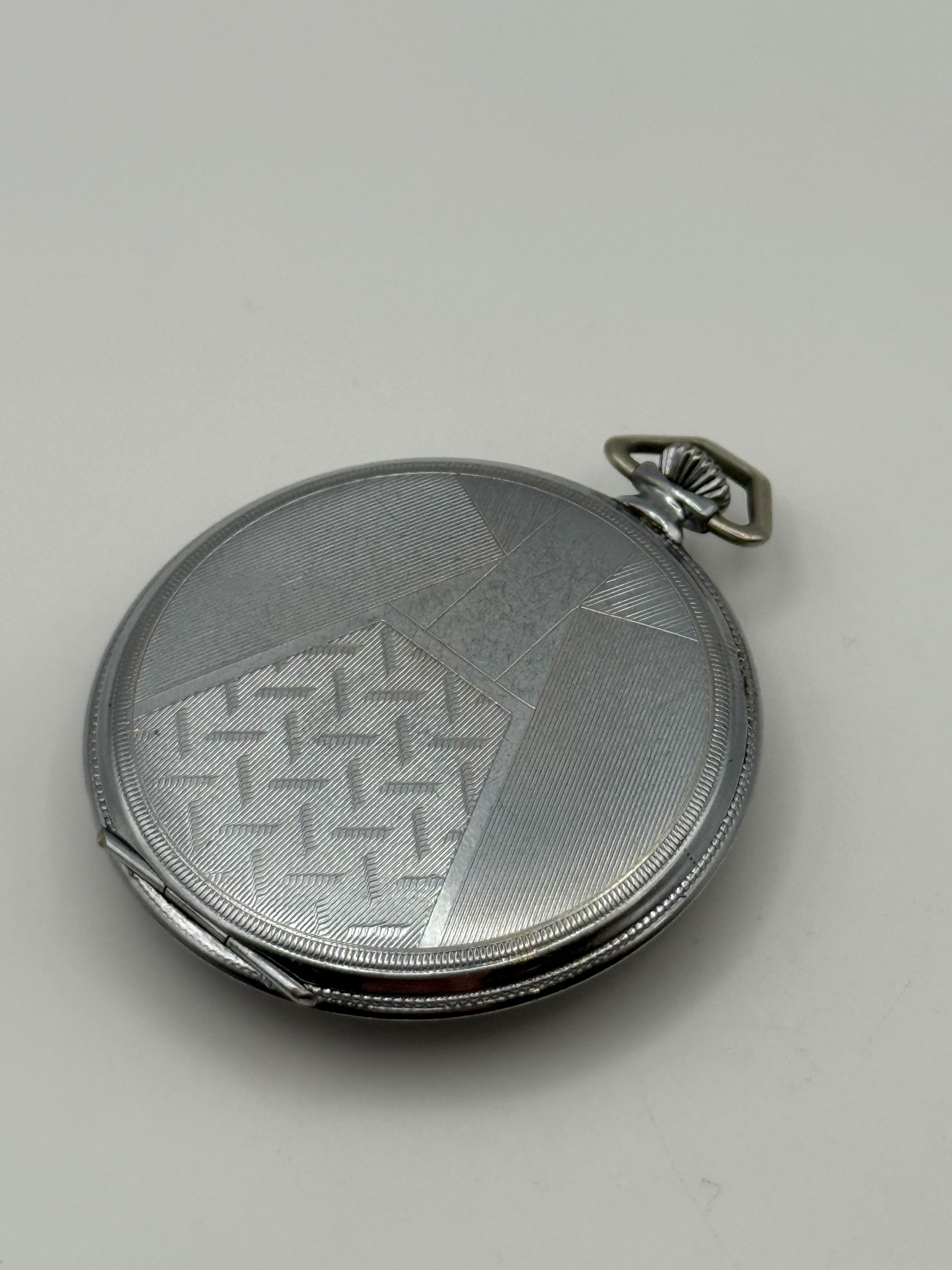 Montre de gousset en métal, cadran à fond beige, chiffres arabes, chemin de fer et trotteuse à 6h. Cuvette guillochée à motifs géométriques.
