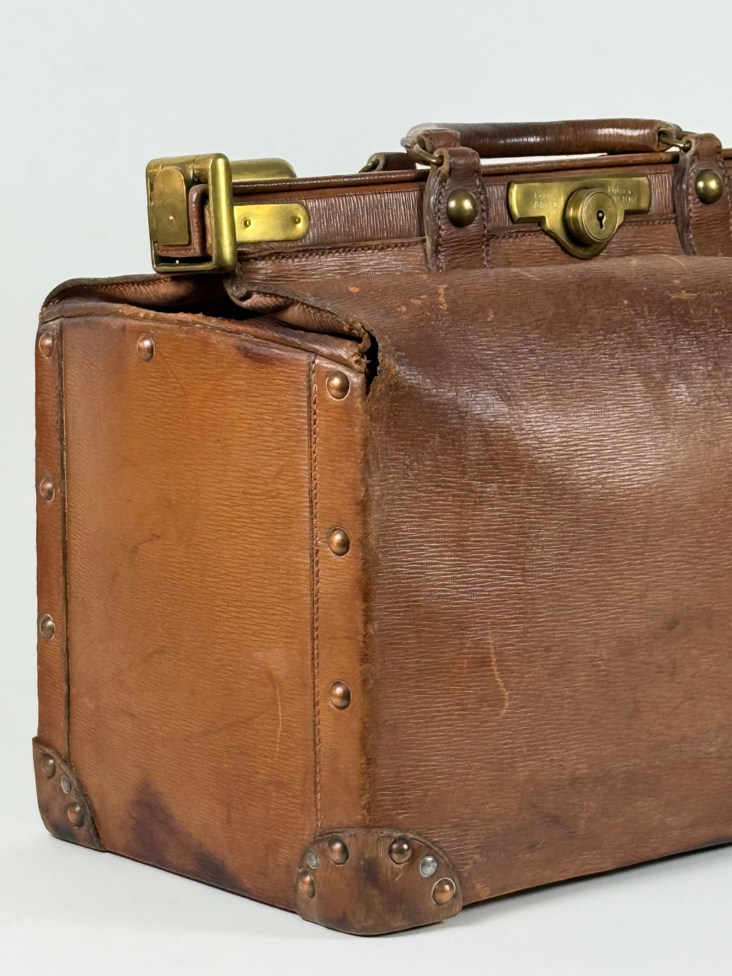 Garnitures en laiton, serrure signée, signature frappée sur le cuir