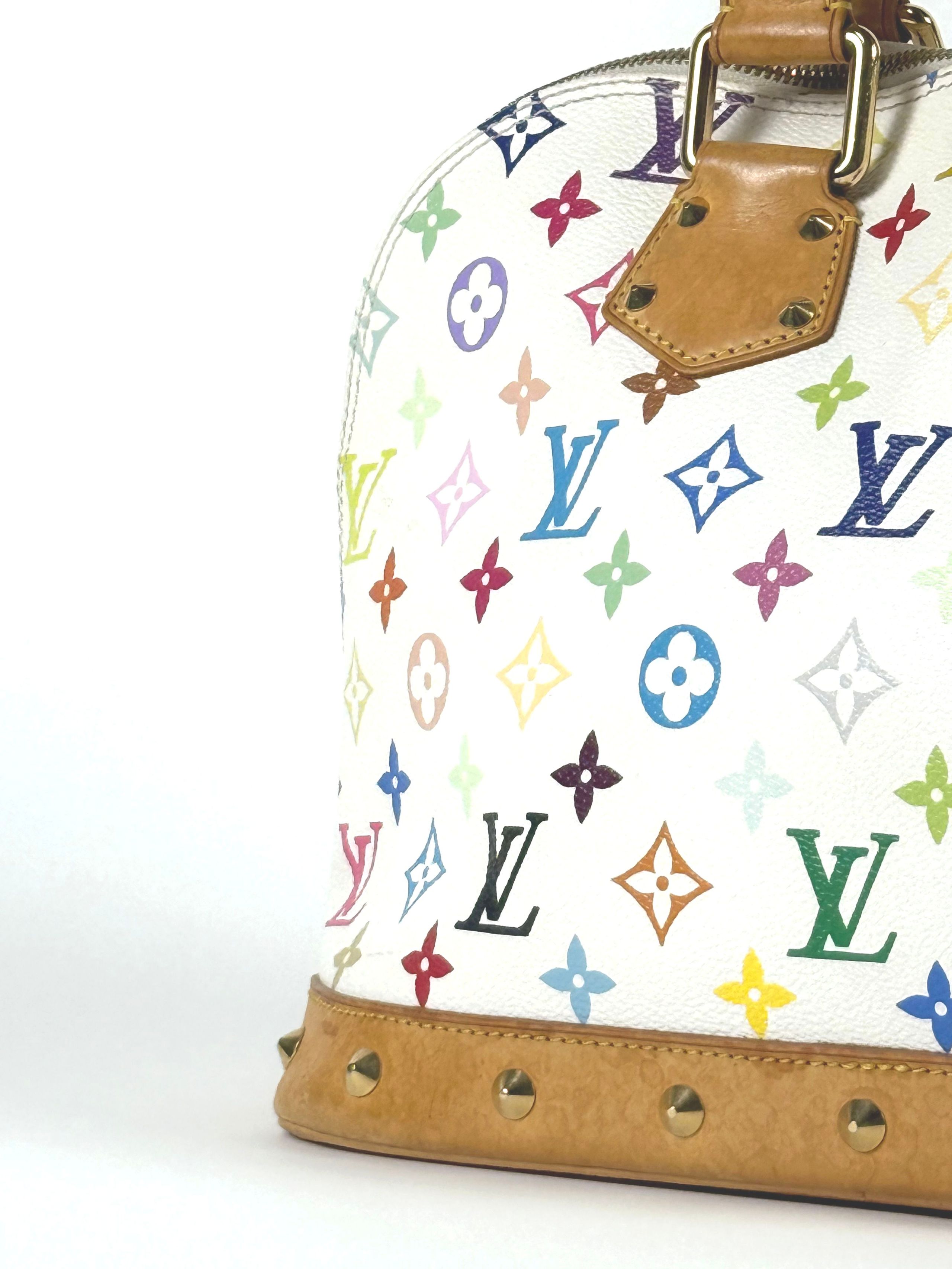Sac Alma en toile Monogram multicolore sur fond blanc et veau naturel partiellement clouté doré,