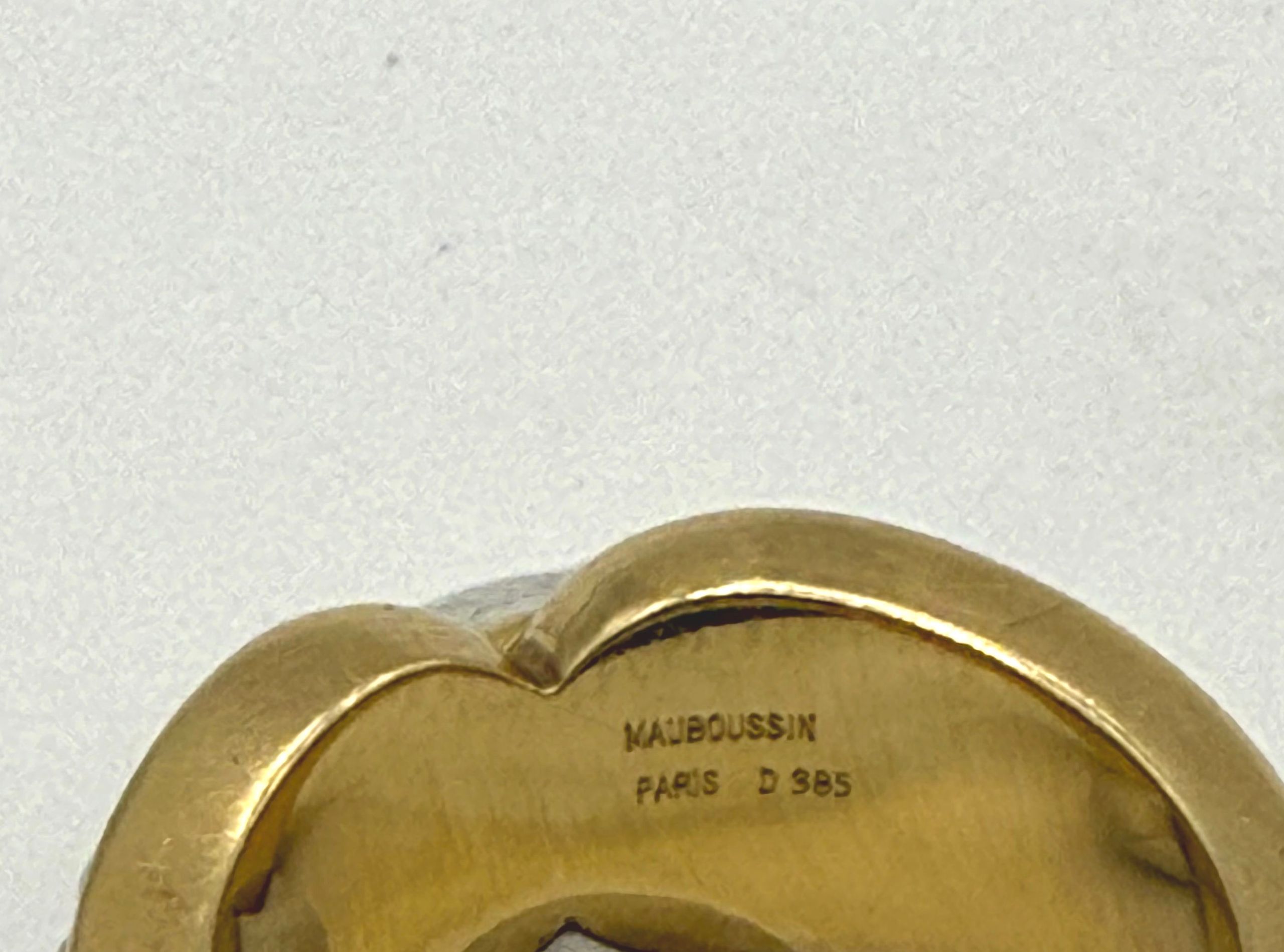 159 - MAUBOUSSIN Paris Bague en or jaune (750 millièmes) stylisant un cordelette épaulée de deux plaques de nacre matelassées.