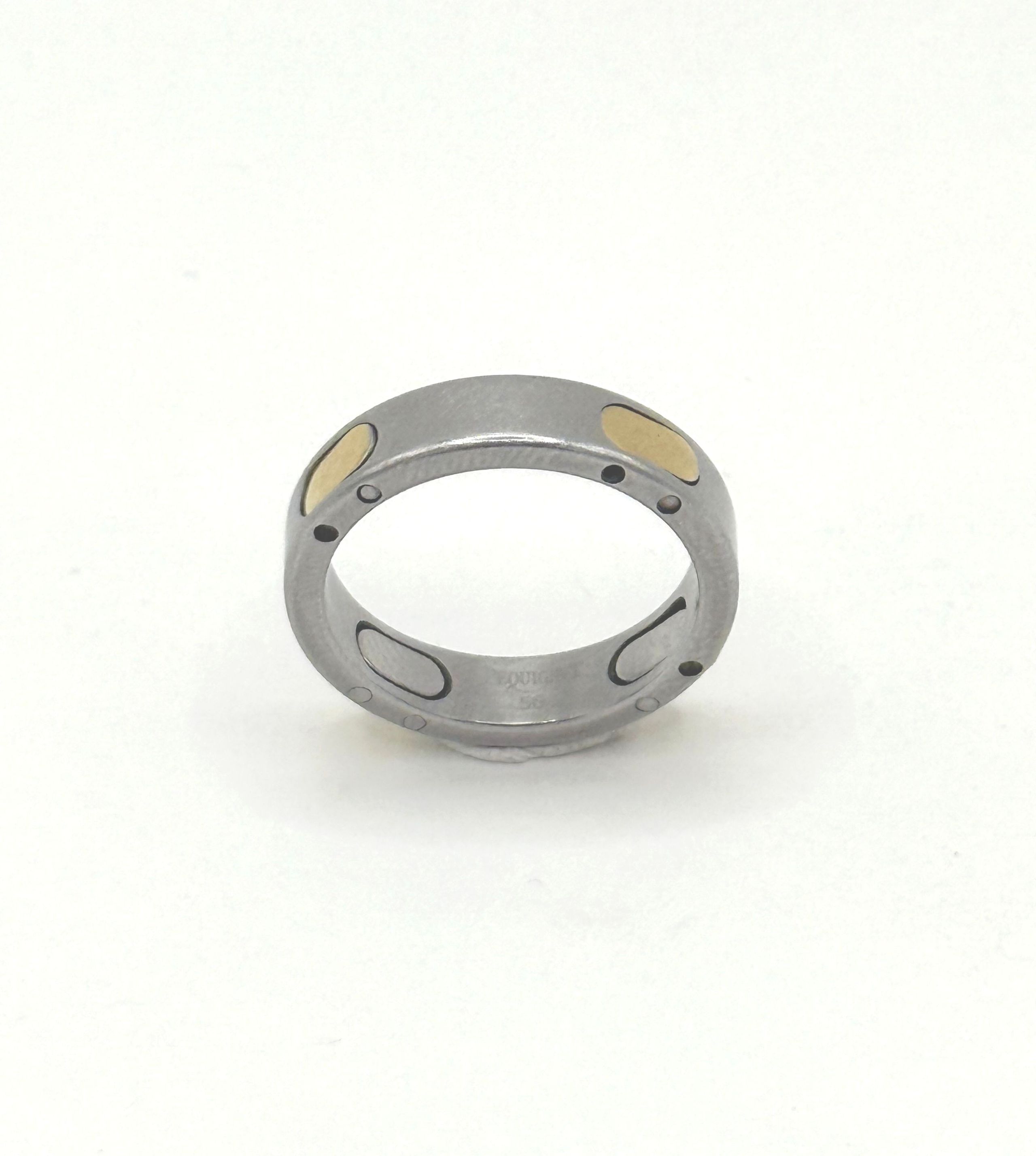 Bague en acier et or jaune (750 millièmes). Signée. Tour de doigt : 56. Poids brut : 4,45. (manque)