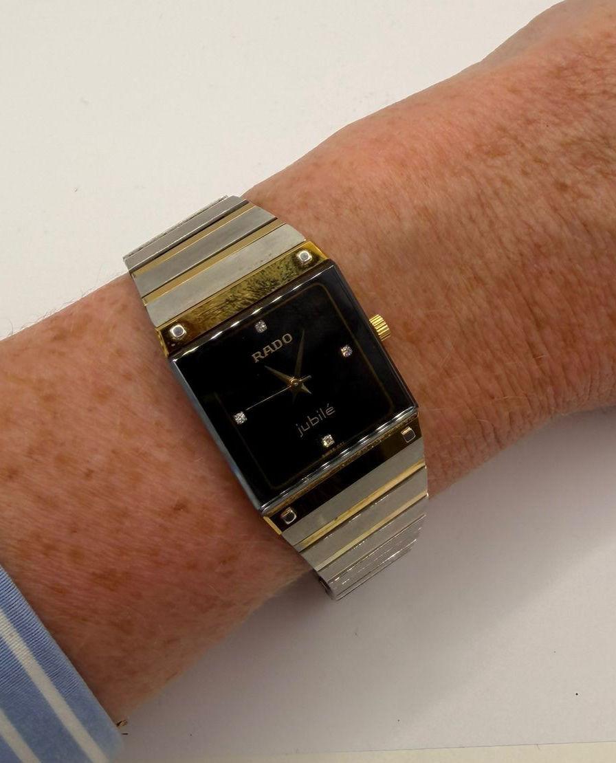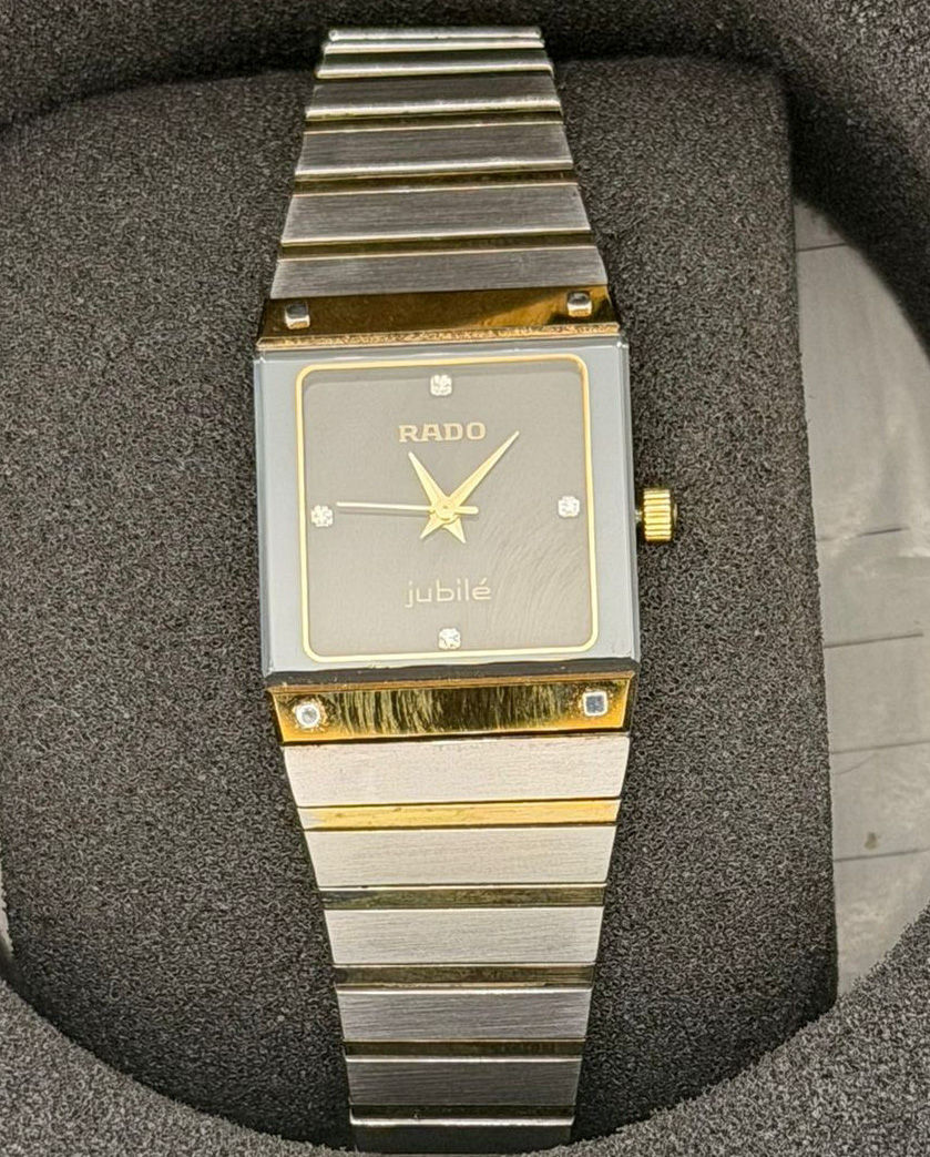 Montre à boitier rectangulaire en métal.