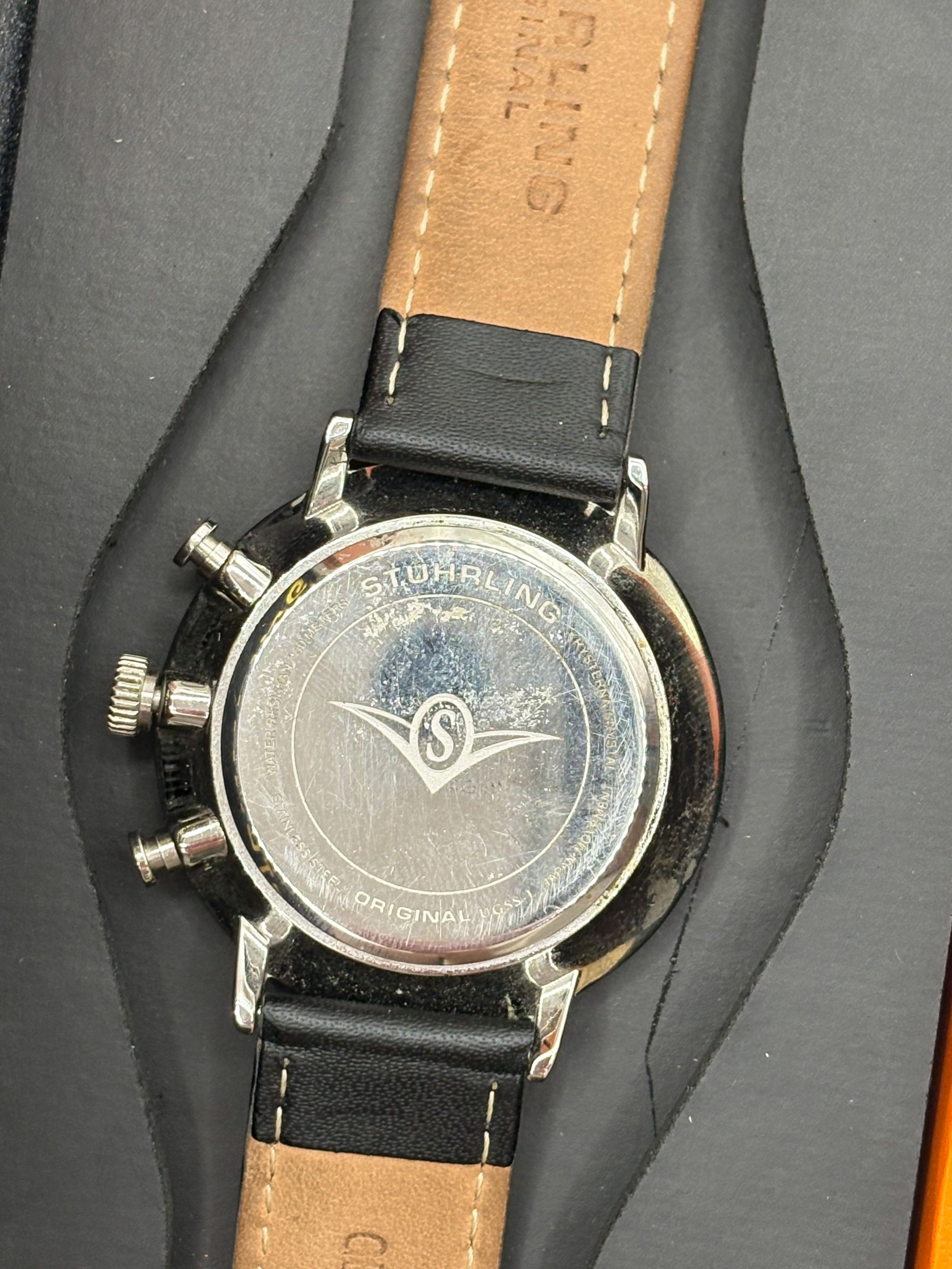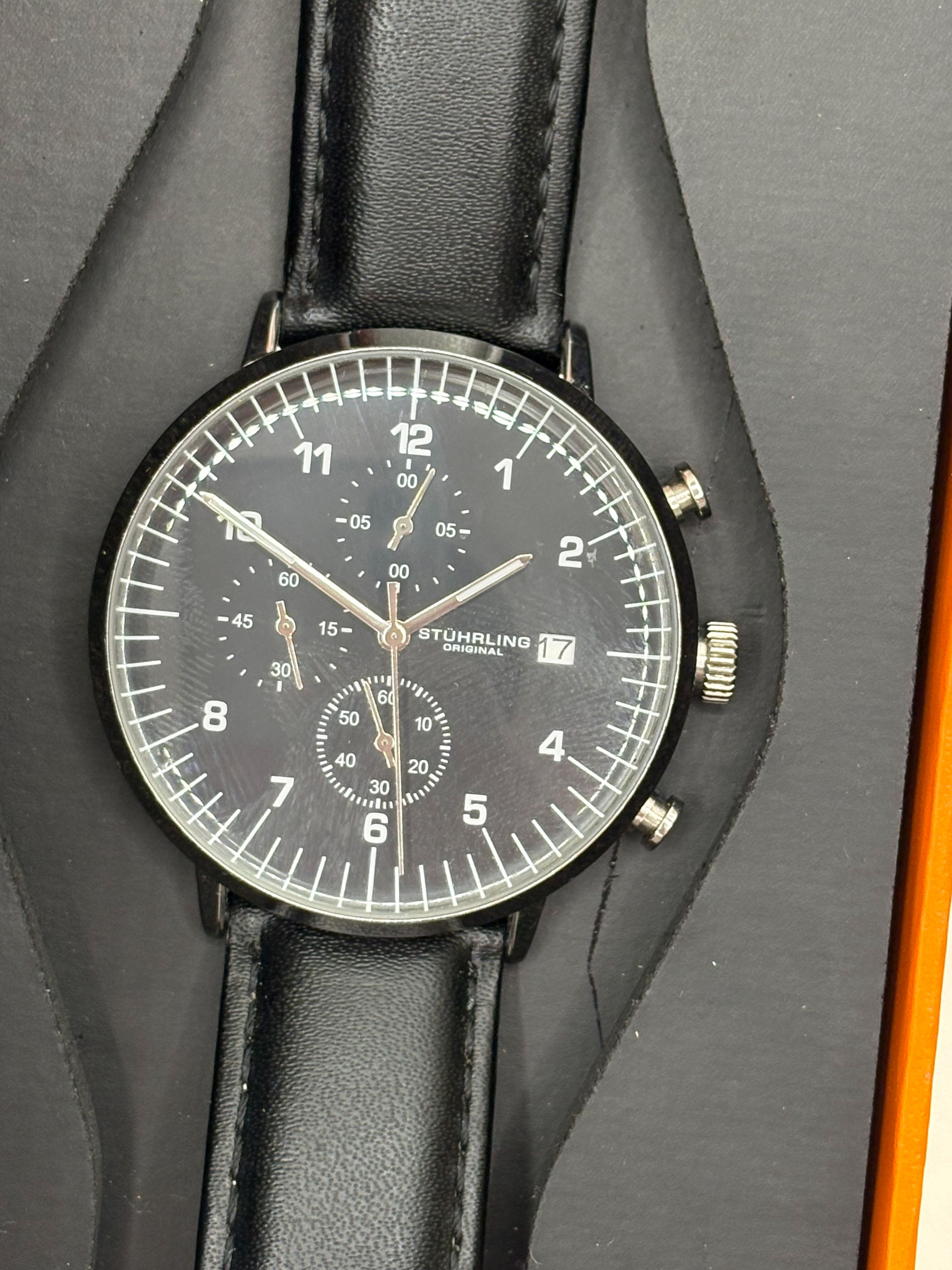 Montre bracelet d'homme, boîtier rond en métal, cadran à fond noir, trois sous cadrans et guichet dateur à 3h.