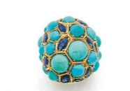 Un saphir incrusté dans de la calcédoine bleue, des rubis posés sur du quartz rose, des diamants anciens sertis dans du cristal de roche : la matière devient sculpture. Ses célèbres manchettes, taillées directement dans la pierre, incarnent cette approche novatrice.